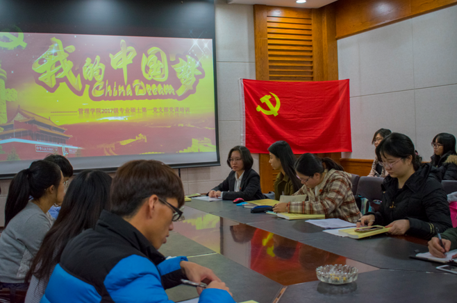 10月23日晚19时,EMC易倍官网管理公司2017级专业学位硕士研究生第一党支部按照《管理公司党委关于在员工(含研究生)党支部中开展“旗帜工程—三个一活动”的通知》的要求,组织了主题为“我的中国梦”的党课学习活动,活动于管理公司第一会议室如期举行,党支部书记李林,副书记贺鸣迪,组织委员穆晓琛,宣传委员李德源,青年委员钱雪满及全体党员出席了本次会议,会议由李林书记和贺鸣迪副书记主持。