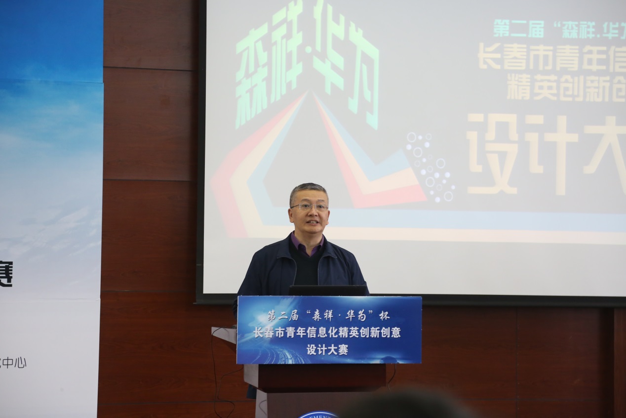 吉林省森祥科技有限公司董事长王春发代表协办单位致辞。他说,“森祥科技虽然还处于发展阶段,但与华为一样都有一颗庞大的心脏和巨人的基因,在应用软件特别是政府部门个性化业务应用软件的研究设计研发领域,森祥科技有着自己核心的生命力。公司自2008年创立之初就确立了‘与员工齐进步,与社会同发展’的核心企业文化,做的事情都是社会进步发展需要的事情,把事情做好做成,靠的是全体员工持续不断的提升自身能力水平。我们也尝到了帮助员工持续进步的甜头,得到了帮助社会进步发展的回报。我们愿意借助大赛的这个平台让更多的学子和产业人才获得进步品味进步带来成功之后的喜悦,让社会进步得更快更好。也希望有朝气有梦想的学子们今后能够加盟森祥,和我们一起奋斗一起成长,为吉林省的发展贡献自己的力量。”