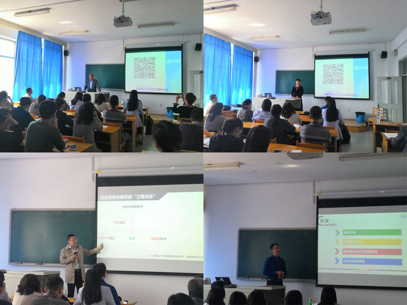 学堂在线产品应用支持中心姚保峰主管对“雨课堂”的安装应用课件语音视频等教学内容的导入和应用等过程进行了清晰的讲解,同时还介绍了“雨课堂”在各所高校的应用情况和评价反馈。在场的师生通过扫描二维码参与问答互动难点反馈幻灯片推送现场答题统计现场调查发送点评或弹幕到投影屏幕,有效展示了“雨课堂”良好的课堂互动及时的授课反馈和多样的授课形式等特点,亲身体验了手机进课堂信息技术辅助实现教与学的过程。