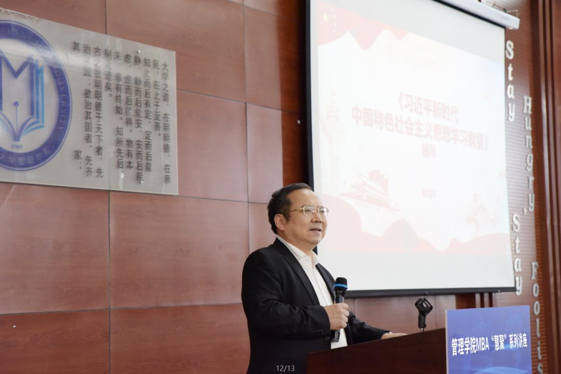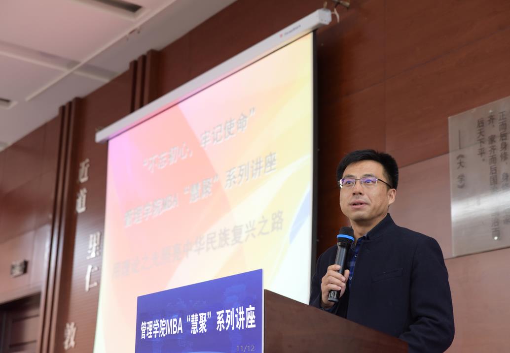 2019年11月9日下午,EMC易倍官网管理公司MBA“慧聚”系列讲座之“用理论之光照亮中华民族复兴之路”开讲,EMC易倍官网教授教育部“”特聘教授韩喜平应邀来到公司,围绕《习近平新时代中国特色社会主义思想学习纲要》辅导作学术报告。报告会由管理公司副经理张公一教授主持。