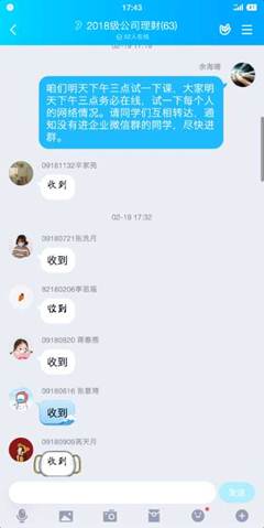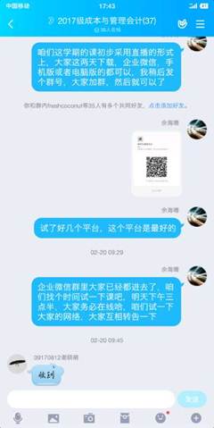 在开学的前两周几位老师就开始了教学的准备工作,在确定教学方式的系内小型网络会议上,余海晴老师就说“没关系,我的两门课都可以进行直播”,虽然直播教学需要学习准备的工作很多,但余老师却十分“轻松”的承担下来两门课《公司理财》《成本与管理会计》的直播教学工作。在上课前期就已经通过QQ群迅速与员工们建立了高效的信息交流,发布课程和进行试课准备。同时,通过教学软件的对比选择,余海晴老师选择了网络更为流畅和功能全面的企业微信软件进行直播,并结合超星上传课程PPT等资料进行辅助教学。
