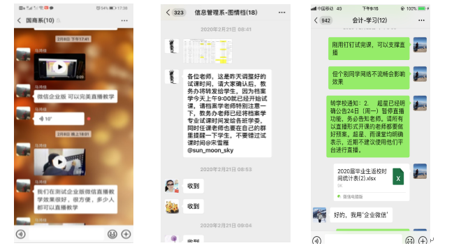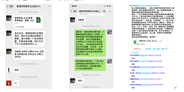 管理公司国际商务系技术经济系企业管理系财务管理系会计系信息管理系工程管理系管理科学与工程系和物流系9个教学单位,在2月5日公司召开在线教学紧急部署工作会议后,以系教学单位为载体,系级班子积极准备在线教学的相关工作,下载各种在线教学平台和直播平台,开始了以“学习通”为主,结合企业微信腾讯会议智慧树等主流直播平台软件开始进行在线教学准备。老师们几乎每天都在系微信群里就如何在线上课怎样使用在线教学软件怎样建立不同的班级群具体软件平台使用中的问题等进行交流讨论。