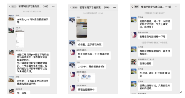 2月5日公司紧急在线教学工作部署会议后组建了“管理公司超星学习通交流平台”微信群,邀请超星顾问对老师使用过程中的问题进行在线及时解答。目前微信群有116人,其中超星有11位技术人员随时解答老师们在使用过程中存在的问题,近100余位公司教师在此群进行相互交流,涵盖了管理公司春季学期开学的所有老师。在课程准备过程中,公司组织教师学习了解在线教学工作流程,转达公司相关精神及在线教学成功案例,老师通过平台微信群交流在线教学经验,及时发布公司各类在线教学工作信息,解答教学平台录课及平台使用中产生问题。