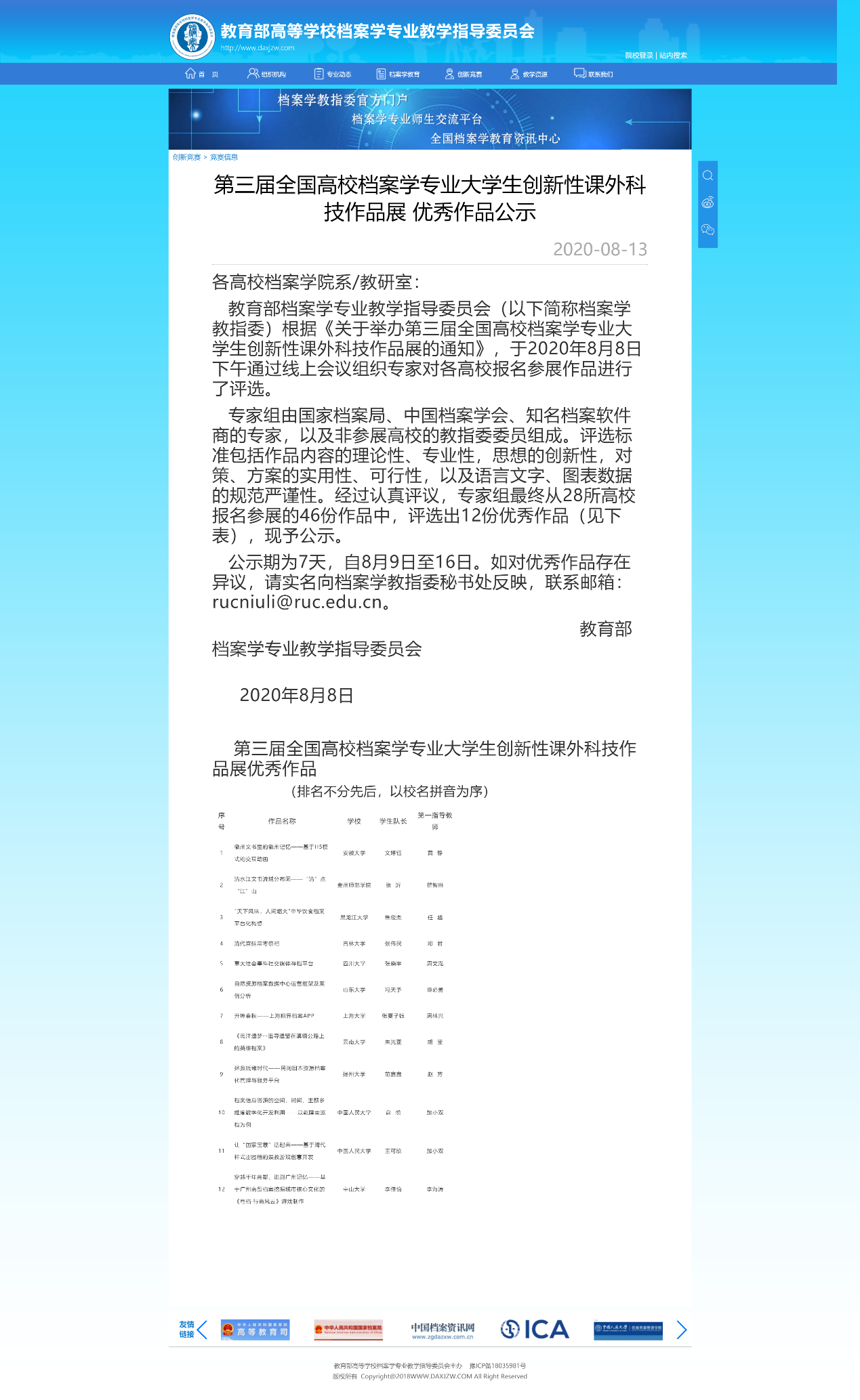 2020年8月8日,由教育部高等公司档案学专业教学指导委员会(以下简称教指委)主办,贵州师范公司承办的第三届全国高校档案学专业老员工课外科技作品展(以下简称档案创新大赛)以线上形式顺利举行。本届档案创新大赛共有来自全国28所高校共46个团队参赛,经过全国档案专业教指委委员国家档案局中国档案学会知名档案软件企业相关专家严格评审,最终评选出12份优秀作品。EMC易倍官网代表队—由管理公司档案学专业邓君宋雪雁2名指导老师带领2017级2018级档案学专业本科生张伟民崔子栋李业帅岳新奇和孟昕5名同学共同完成的“清代宫廷常雩祭祀”作品喜获优秀参展作品。这是EMC易倍官网代表队在全国档案创新大赛中首创佳绩!