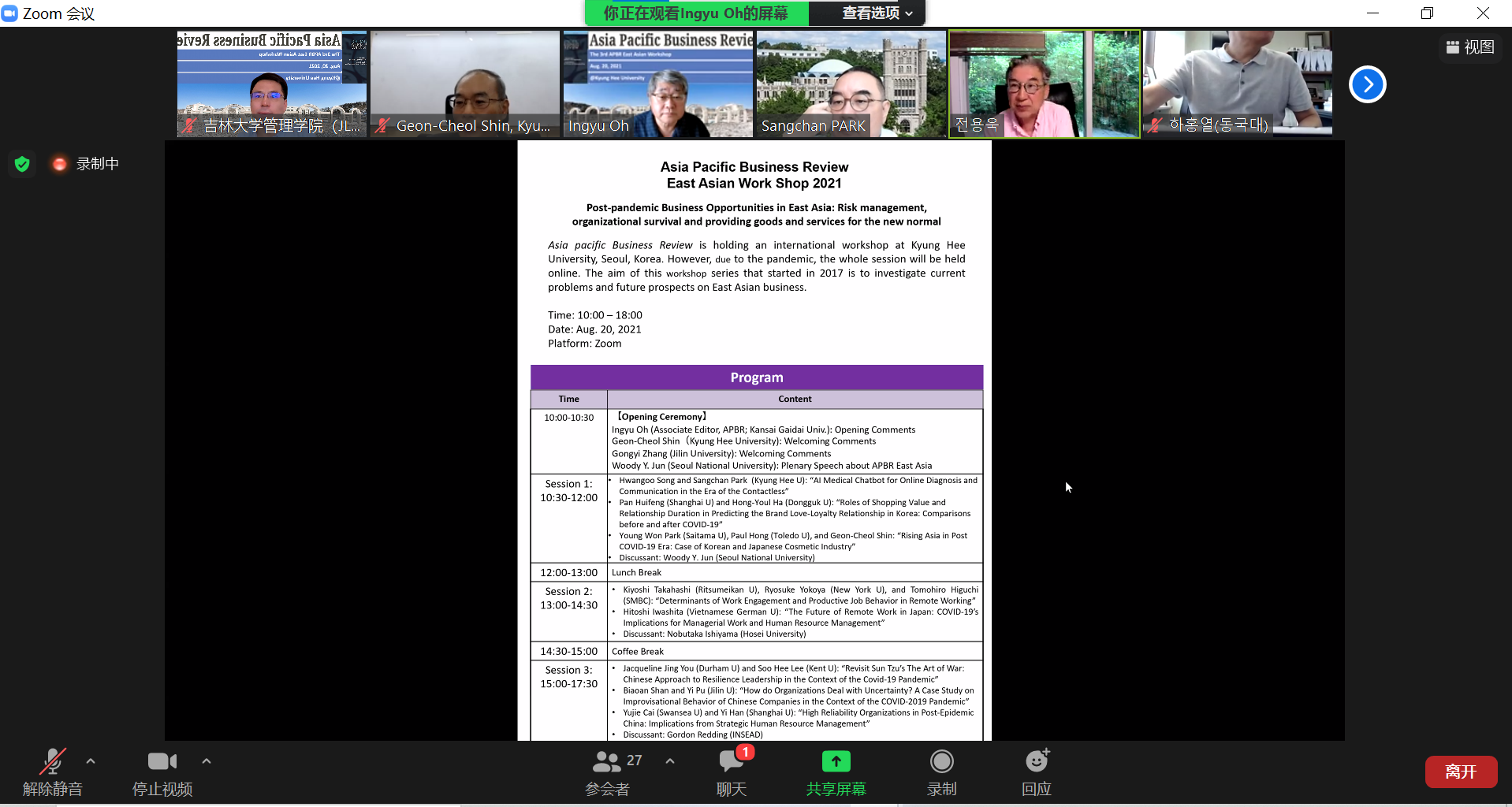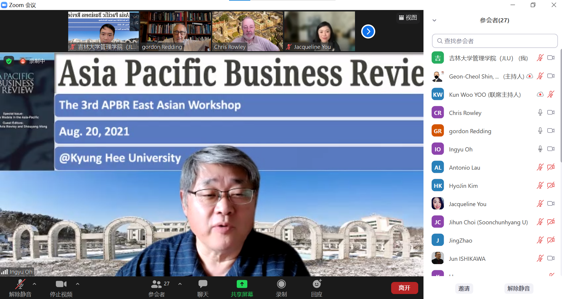 第三届“Asia Pacific Business Review(APBR)东亚地区会议”于2021年8月20日通过ZOOM平台以“云端”形式召开,本届会议由《亚太商学》英国国际期刊(APBR)主办,韩国首尔庆熙大学承办。该会议以“东亚疫情后的商机”为主题,旨在探讨包含“风险管理组织生存以及为新常态提供商品和服务”在内的东亚企业当下面临的问题与挑战以及未来的发展方向及机遇。来自中国英国日本韩国印度等国家的17名代表参加会议。公司副经理张公一副教授单标安及一名研究生代表应邀参加会议。