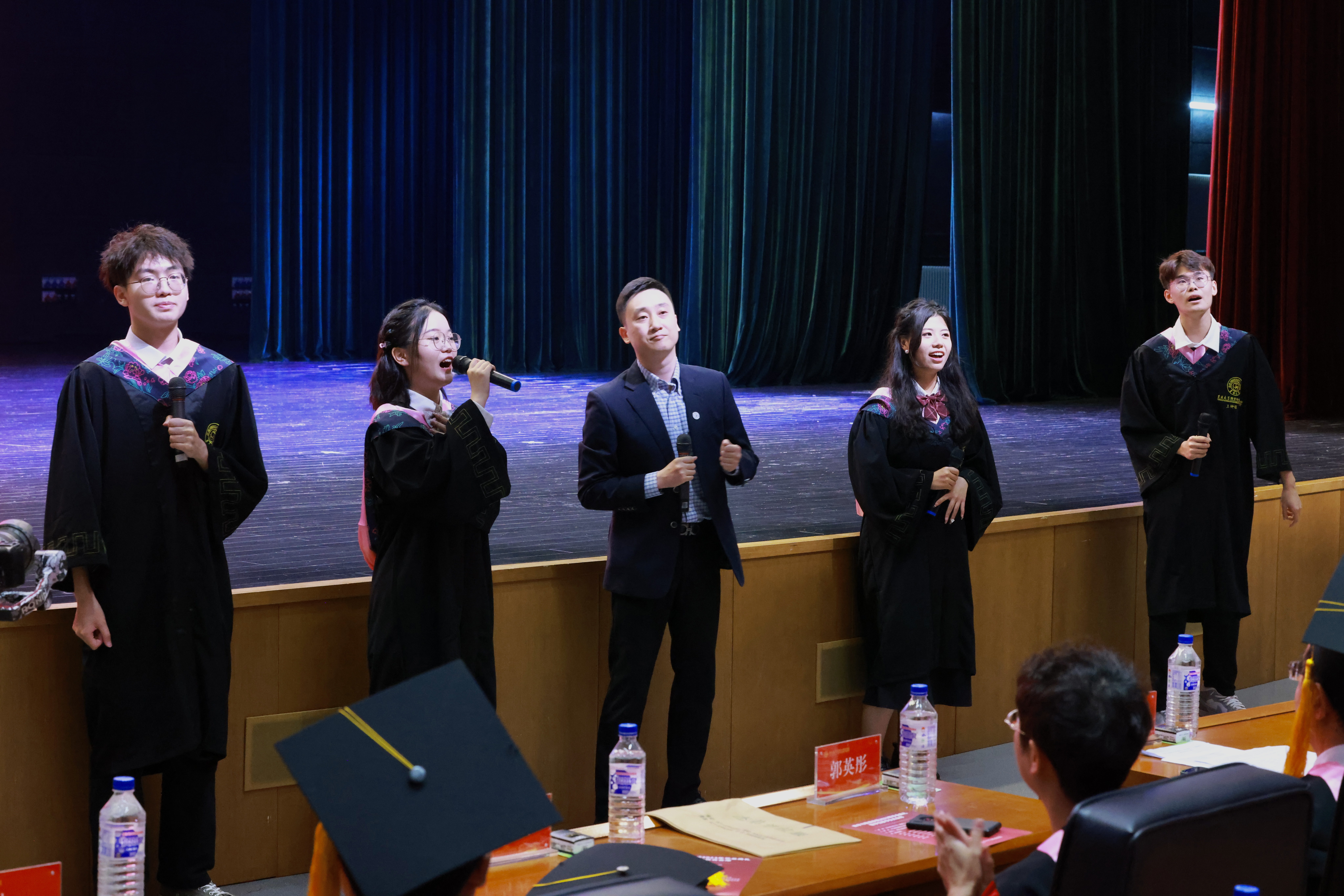 典礼开场前,2019级辅导员刘翔宇老师陈卓老师与几位研究生同学精心准备了《你曾是少年》《New boys》《星辰大海》等歌曲。清脆悠扬的歌声流转着青春的气息扑面而来,跳跃的音符盛情礼赞着这群闪光的少年,此时此刻,这场不舍的离别,是闪光灯亮起的璀璨星海,是同学们呼喊聚集的热烈青春,情谊永存。