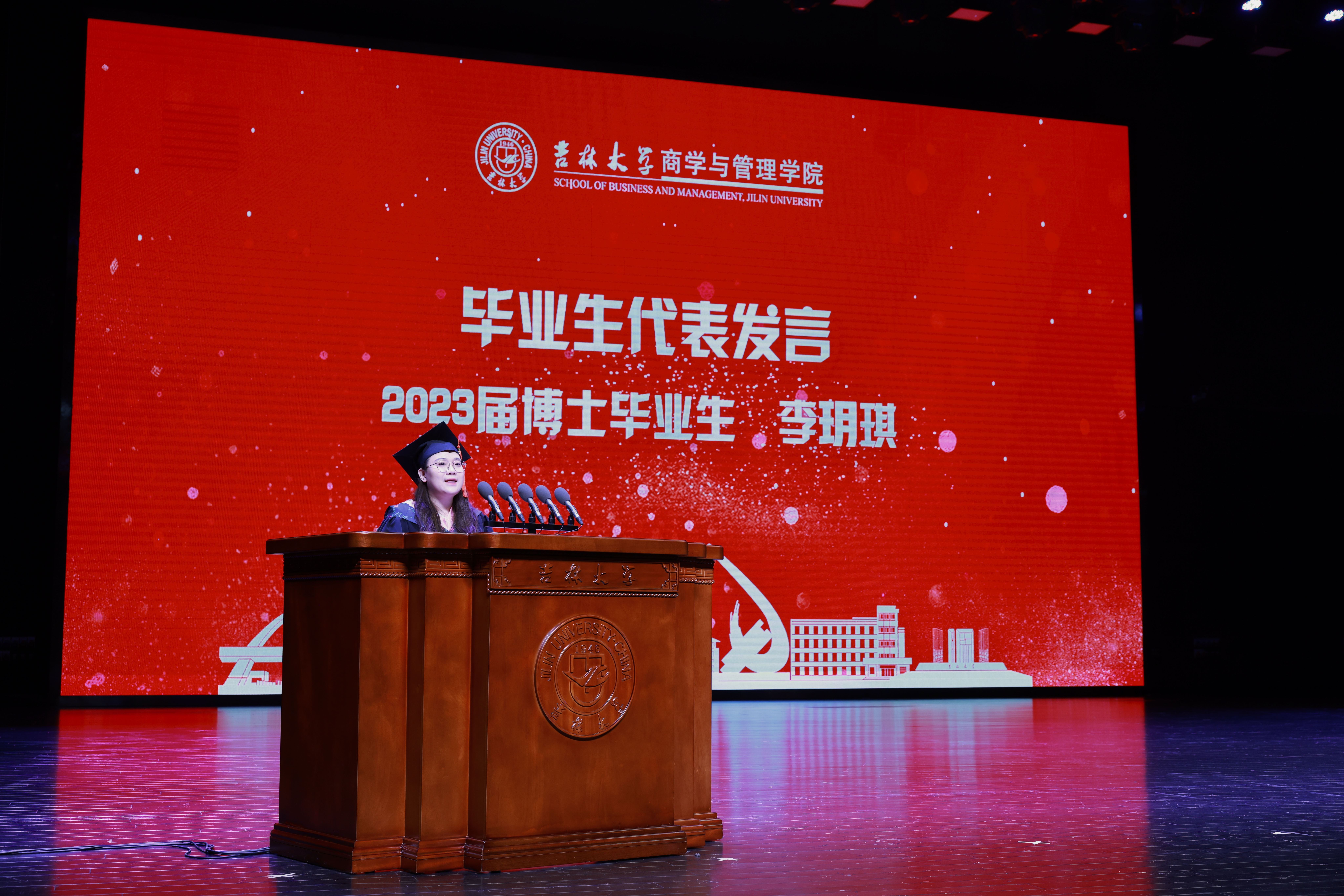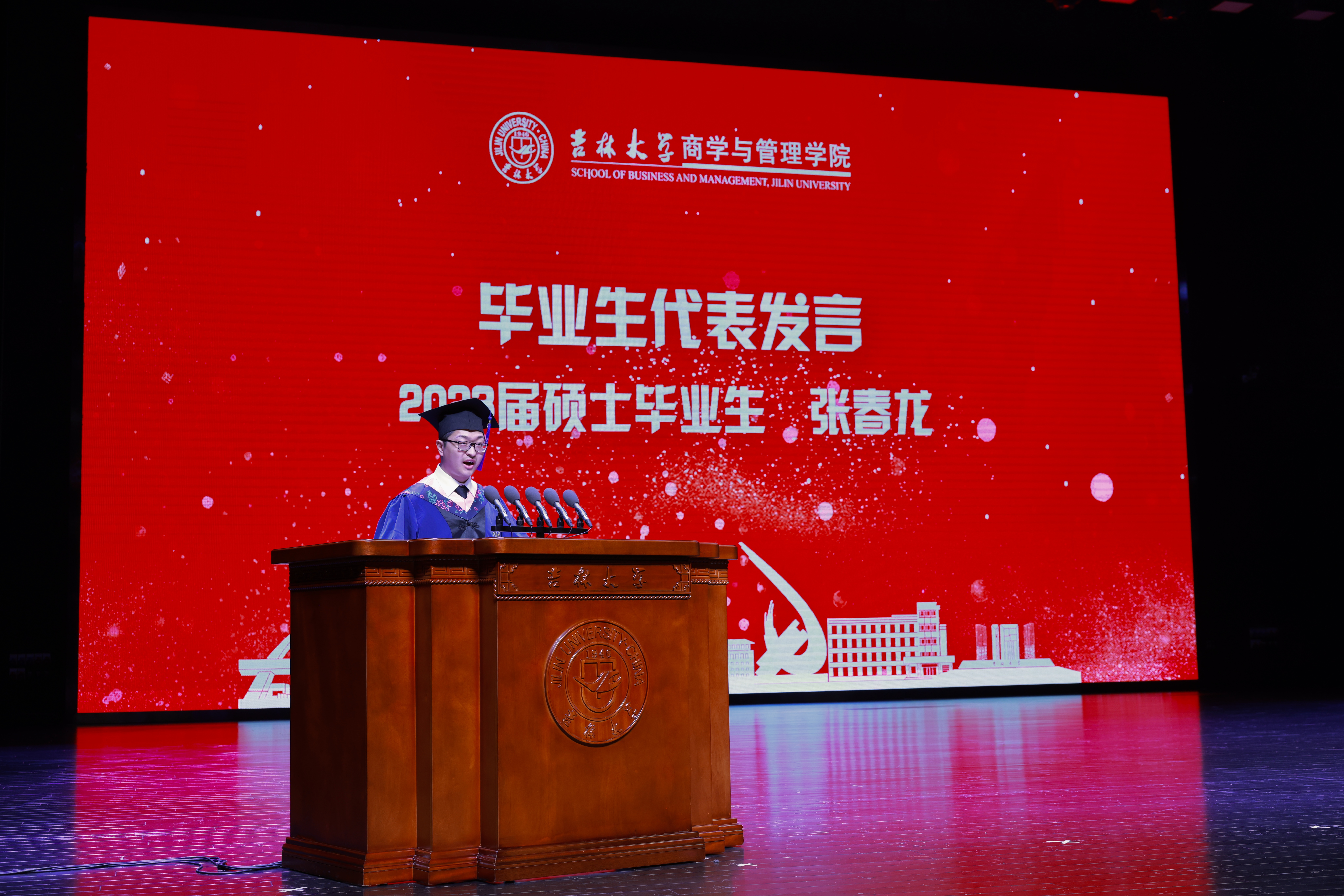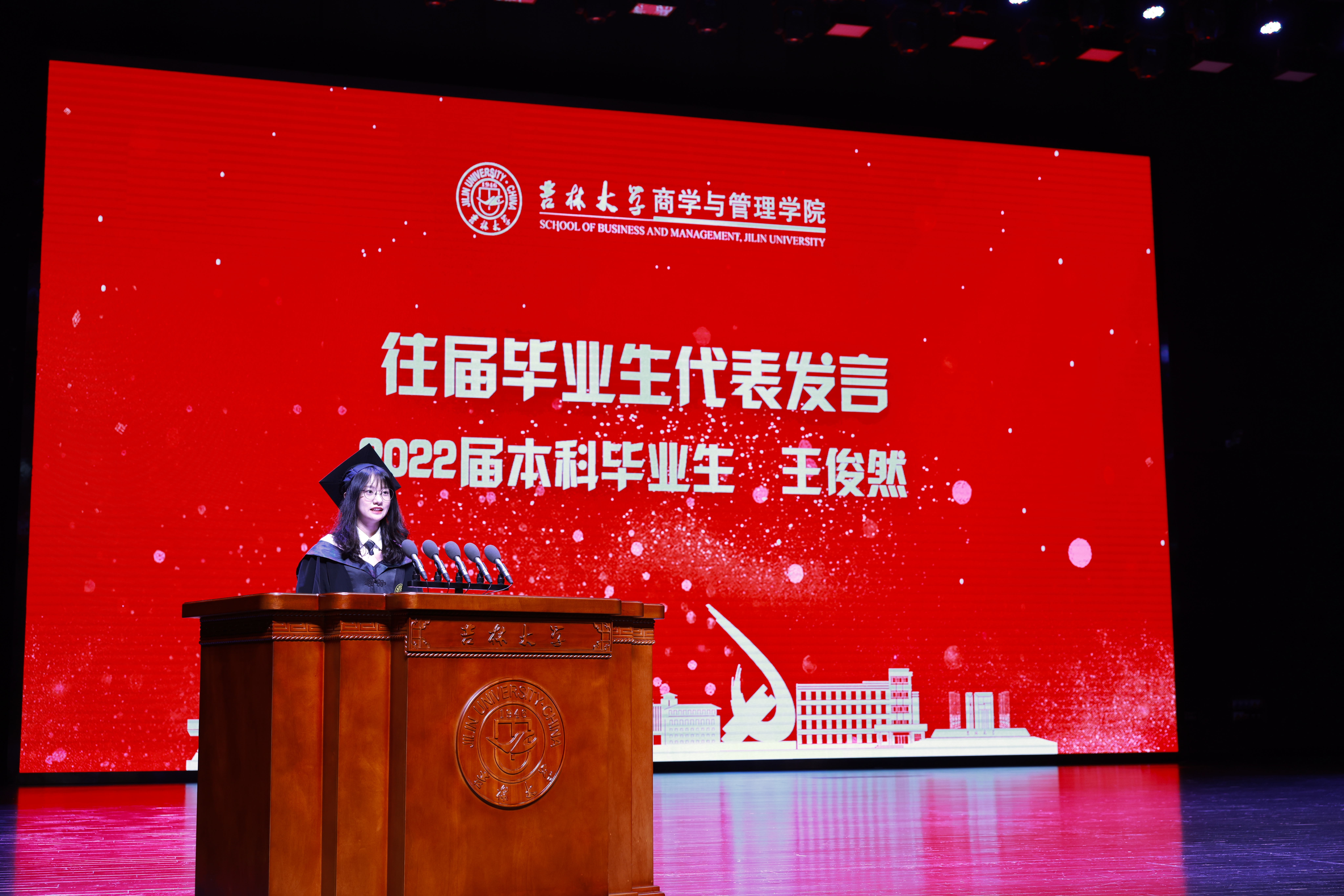 典礼上,往届毕业生代表2022届财务管理本科毕业生王俊然进行了发言。王俊然同学回顾校园生活,深切表达了对母校的怀念与不舍,展望未来,她希望在以后的工作与生活中继续秉承吉大求实创新励志图强的精神,砥砺前行。