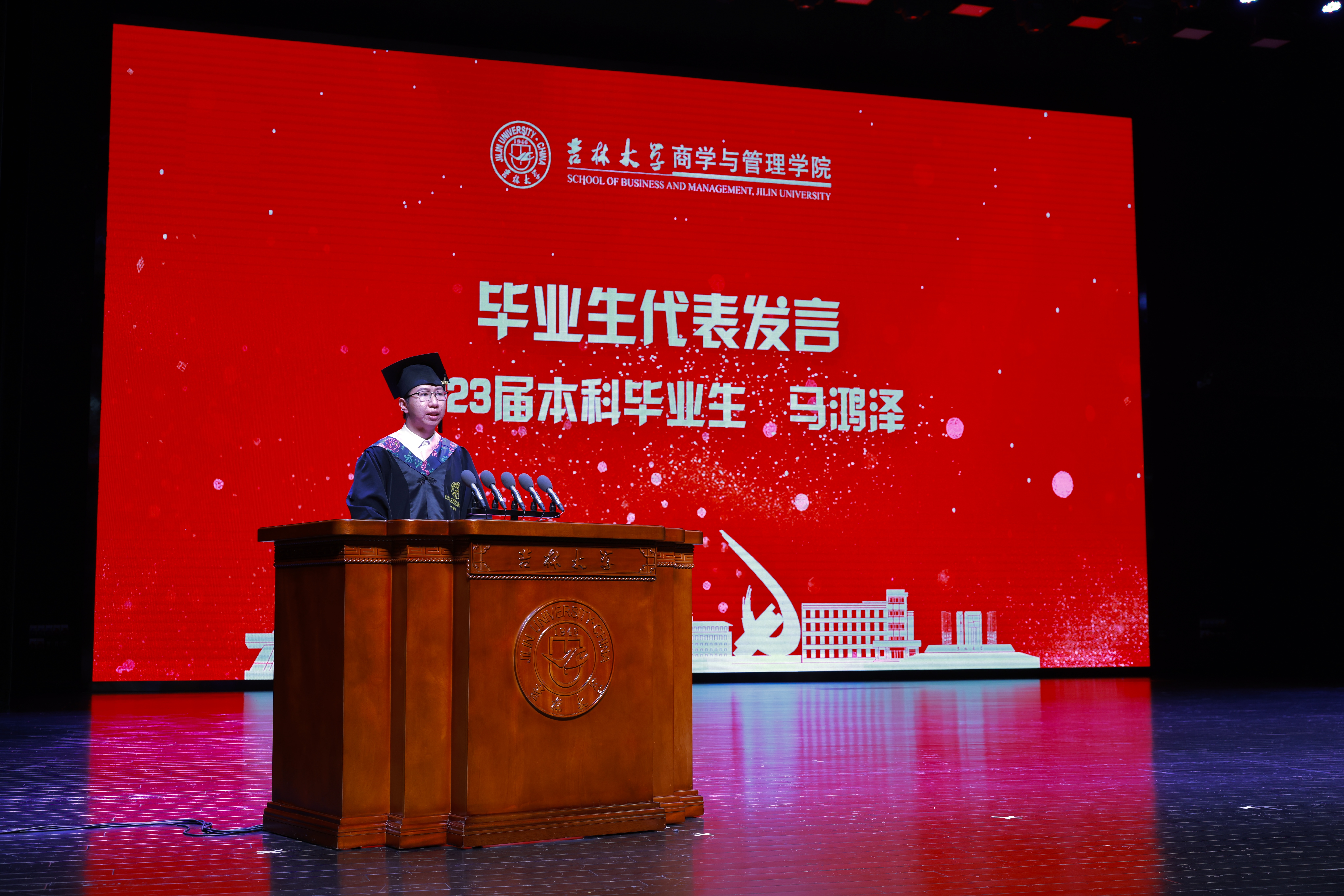 本科毕业生代表EMC易倍官网十佳老员工2023届信用管理本科毕业生马鸿泽同学进行了发言。马鸿泽同学特别感谢了母校对自己的培养。身为党员,他强调“红”与“专”是吉大人身上永不磨灭的“根”与“魂”;面对未来,他提出将“求实创新”“励志图强”的吉大精神贯彻到学术与生活中去,潜心贯注创新科研,积极向上规划生活,不负时代,共创未来!