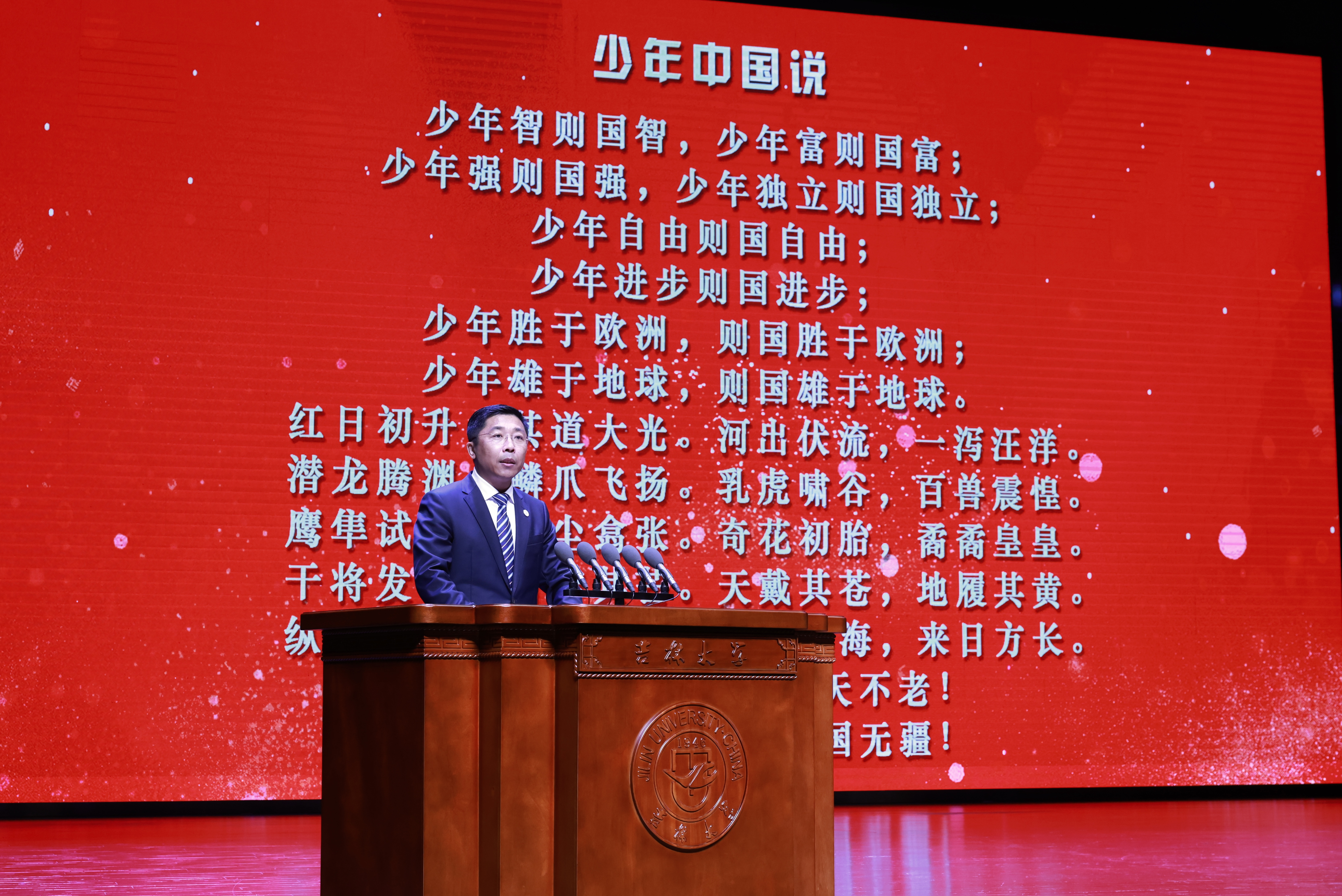 典礼最后,赵军教授带领全体毕业生齐声朗诵《少年中国说》,以声声少年家国的豪迈气概,勉励在场各位同学敢于争先奋勇向前,立志做有理想敢担当能吃苦肯奋斗的新时代好青年!