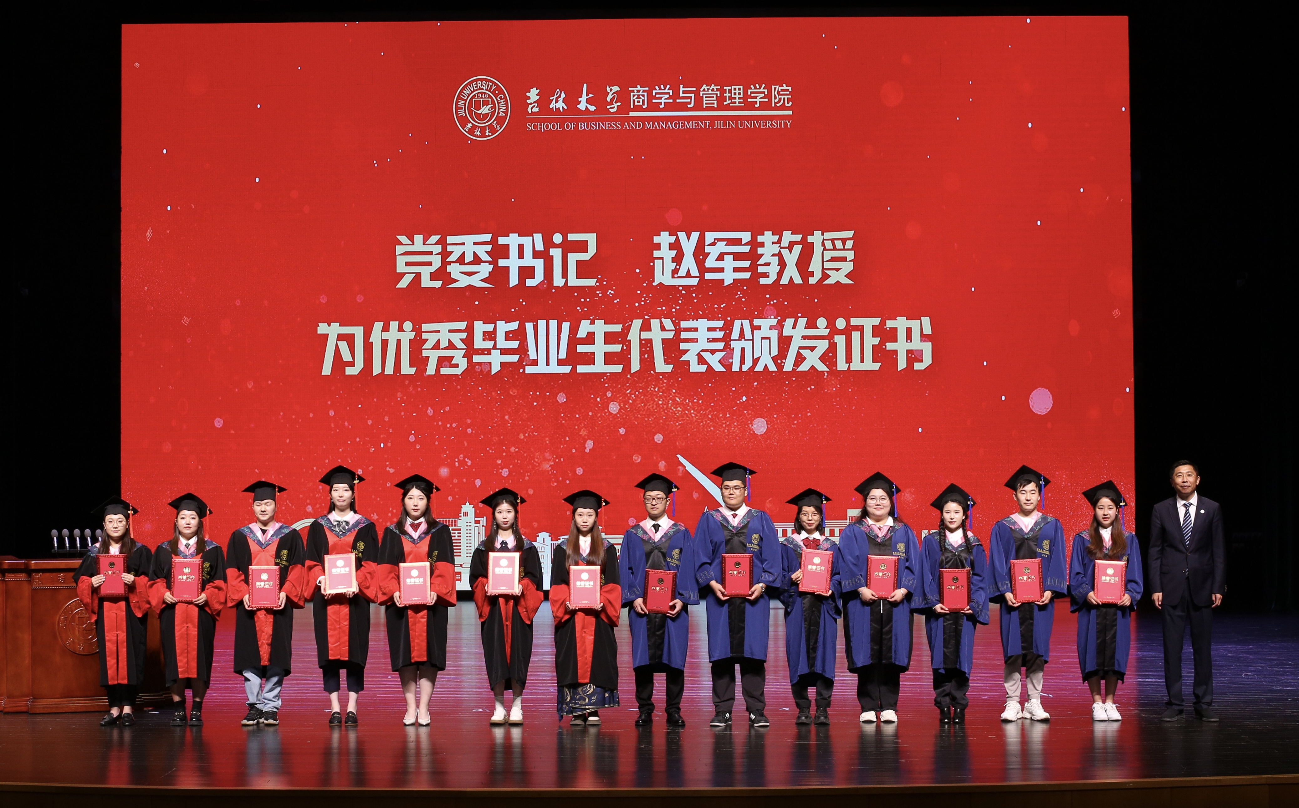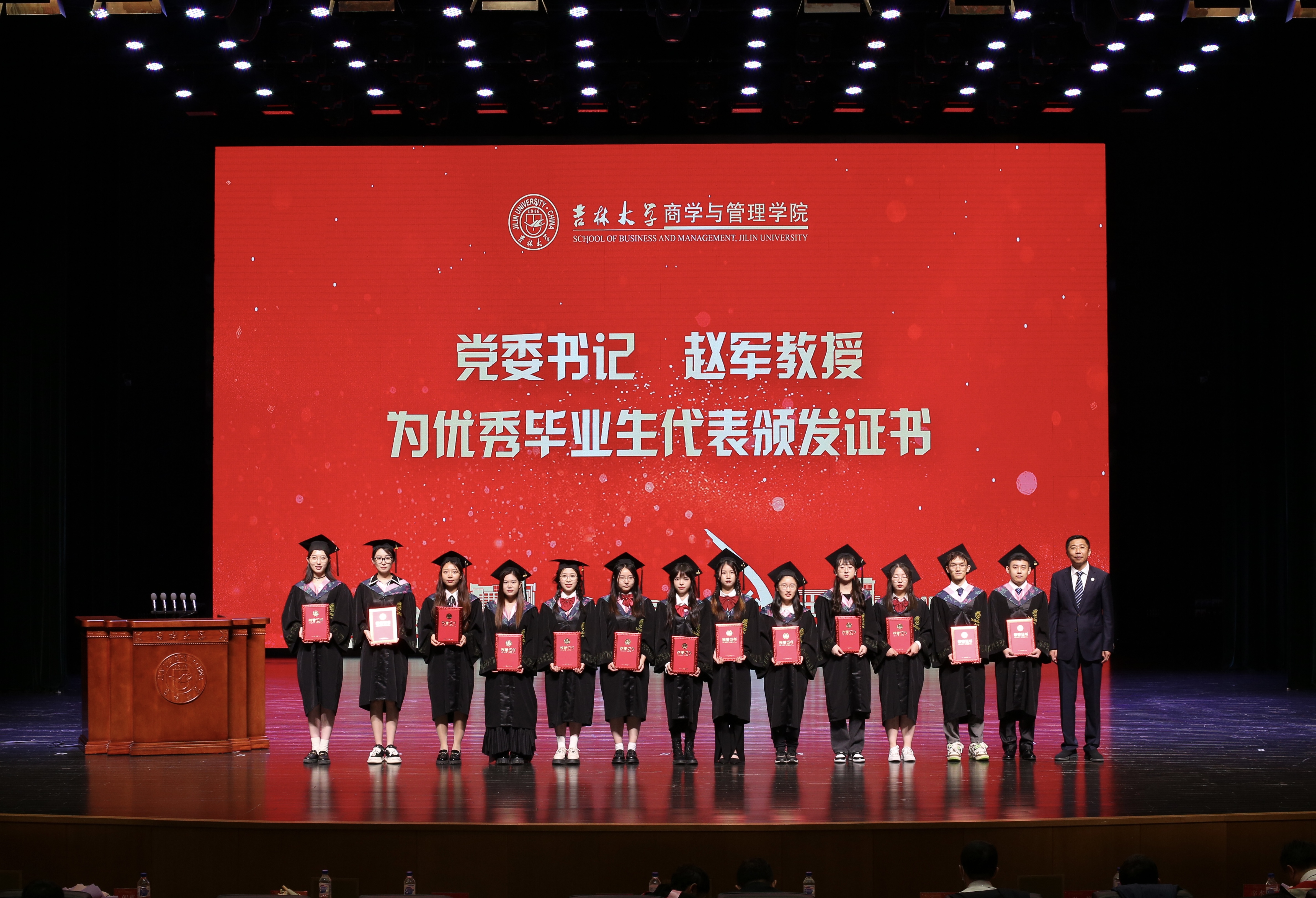 公司党委书记赵军教授为优秀毕业生代表颁发证书。这是一份荣耀,更是一份力量,是商管师生的精神共勉,更是传承一份责任一份担当,愿同学们在前行的道路上继续笃行慎思,求真务实,坚持深耕不辍,必有未来可期!