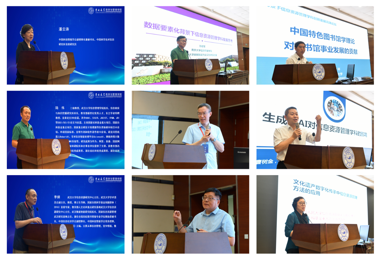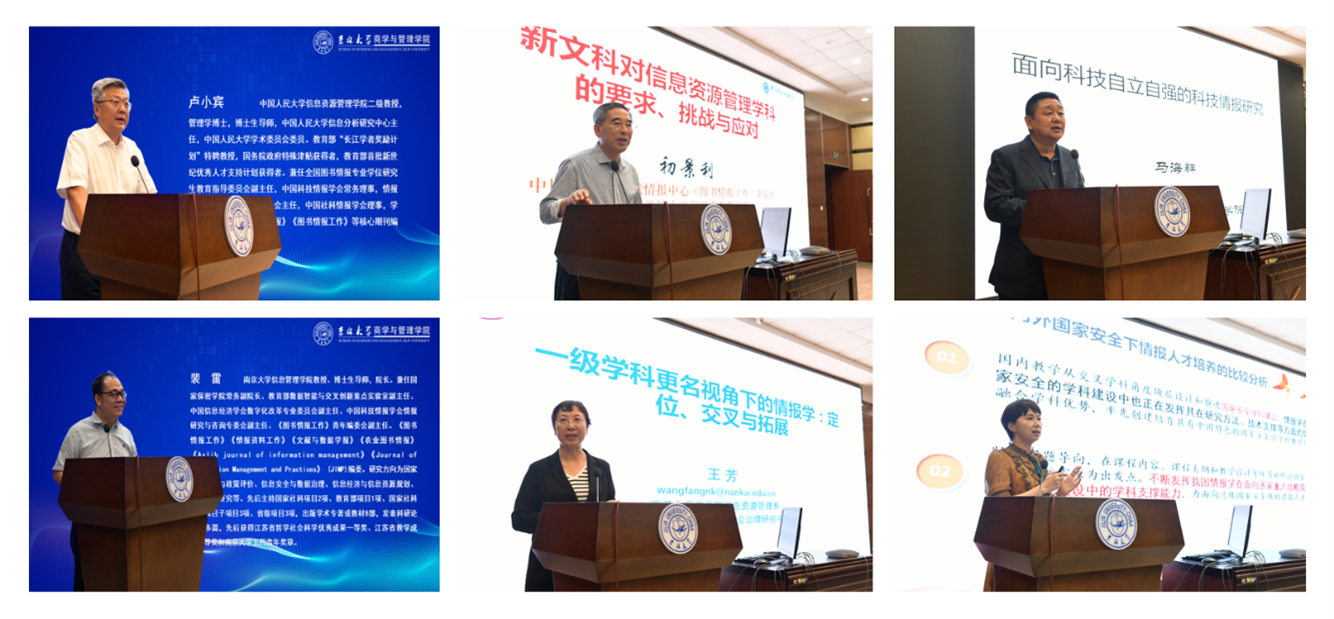 孙建军教授详细解读了数据要素化背景下信息资源管理学科的未来发展;柯平教授结合中国特色图书馆学理论对图书馆事业发展的影响,阐述图书馆学理论对其实践发展的突出贡献和重要影响;朱庆华教授梳理了信息资源管理学科发展史,并指出投入少产出大规模小见效快和渗透广支撑强,是信息资源管理学科相较其他社会科学的突出优势和特点,也是学科未来发展应注重的方向;曹树金教授以“生成式AI对信息资源管理学科的影响”为题详细探讨信息资源管理学科在最新技术影响下的发展趋势;周庆山教授从数智技术变化入手,梳理了信息资源管理领域技术演进及其规则应对策略;周晓英教授从文化强国建设战略要求入手,探讨了图书情报方法在文化遗产数据资源建设中的应用途径及其可能性。初景利教授明确了新文科在鼓励学科交叉融合重视技术方法应用强调团队建设效果和支撑国家战略需要等方面的核心特征,并指出信息资源管理学科应从定位明确课程体系设计团队多元化员工应用能力培养和大学科作用发挥等多方面形成独特的学科优势特色;马海群教授以“面向科技自立自强的科技情报研究”为题,突出强调新时代的情报学研究发展在学科体系学术体系话语体系和学术共同体等各个方面的未来潜力和发展方向;王芳教授从学科更名视角入手,阐述情报学定位交叉与发展的未来前景;最后,王晰巍教授结合新技术发展背景下严峻的国际安全局势,论述总体国家安全观下情报人才的实际需求,就未来人才培养体系模式和可能进行了深入分析和探讨。