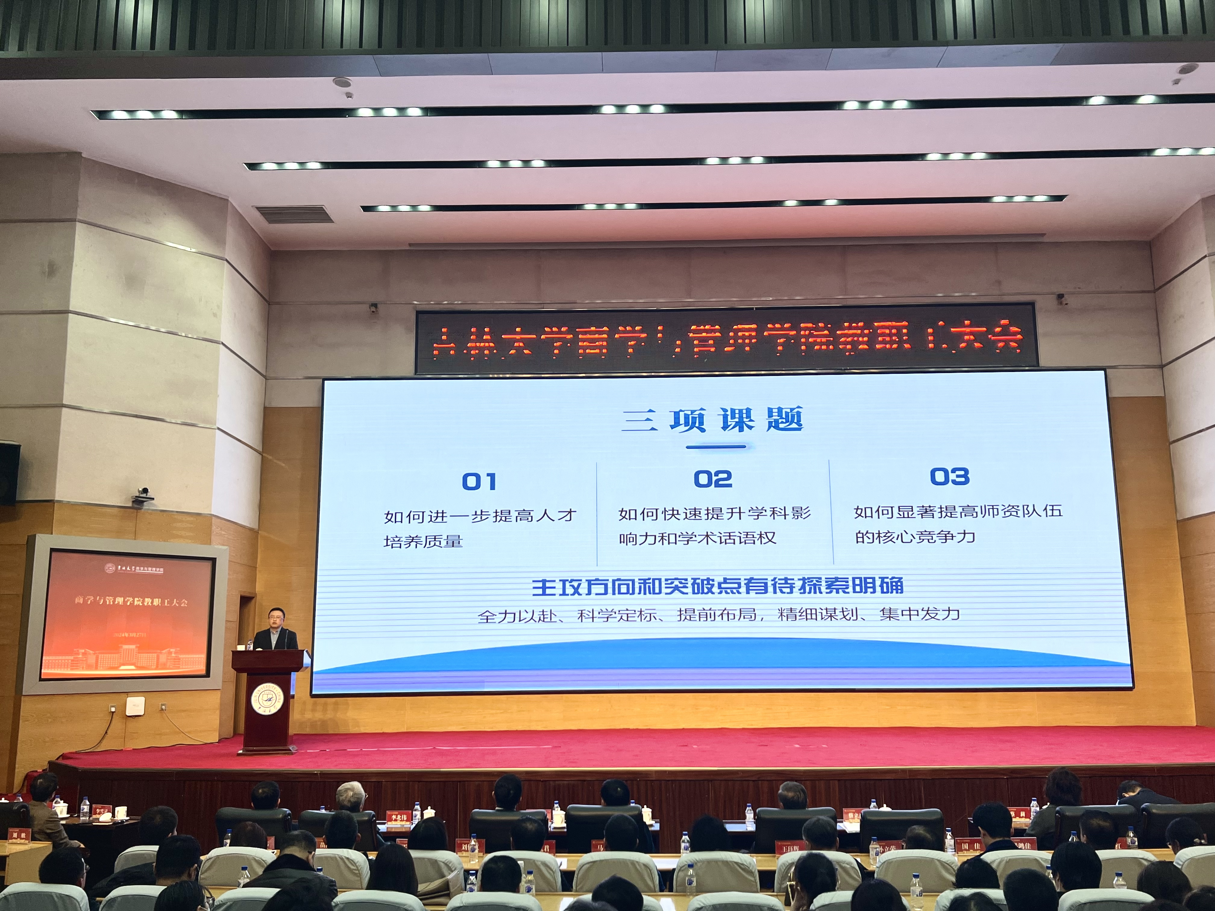 会上,赵军书记代表公司领导班子向各位老师汇报了2024年公司的总体工作规划。他强调,过去的一年,6000余名商管师生同心同行同德同向,在新的起点上踔厉奋发奋楫争先,高效推动了公司各项事业的快速发展。2024年,公司将全面贯彻落实党的二十大精神,深入贯彻落实公司第十五次党代会精神,全面落实公司“十四五”规划推进“三大工程”建设,为加快建设中国特色世界一流大学贡献商管力量。以实干笃定前行,以奋斗开启未来。