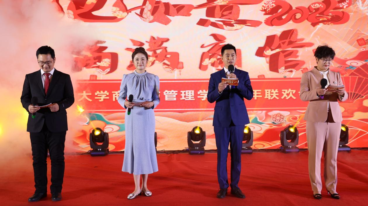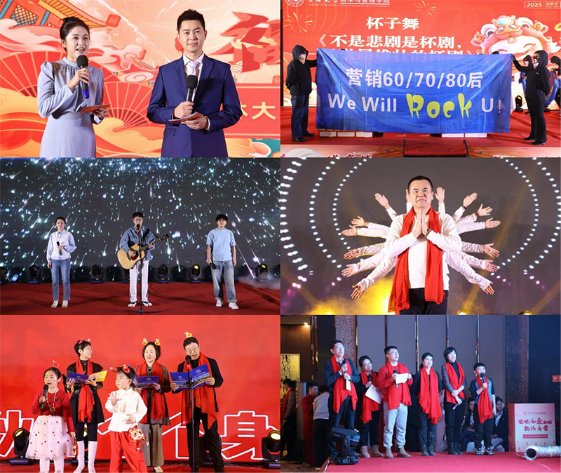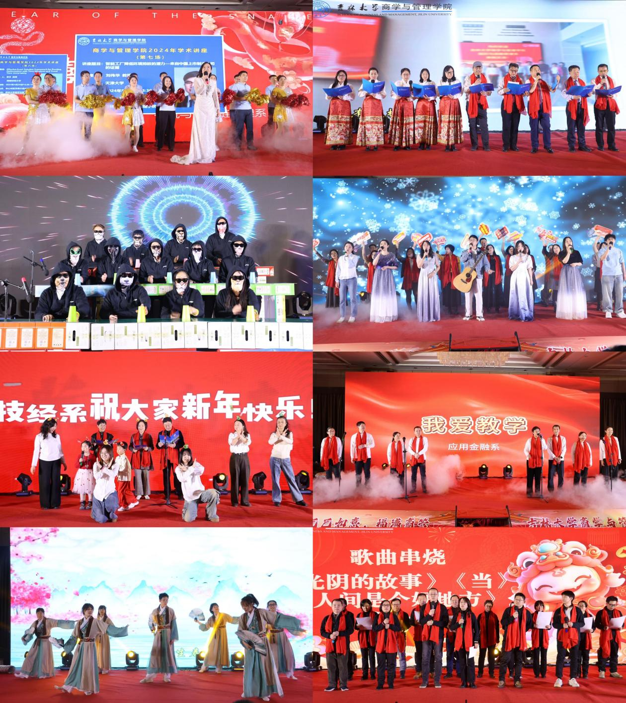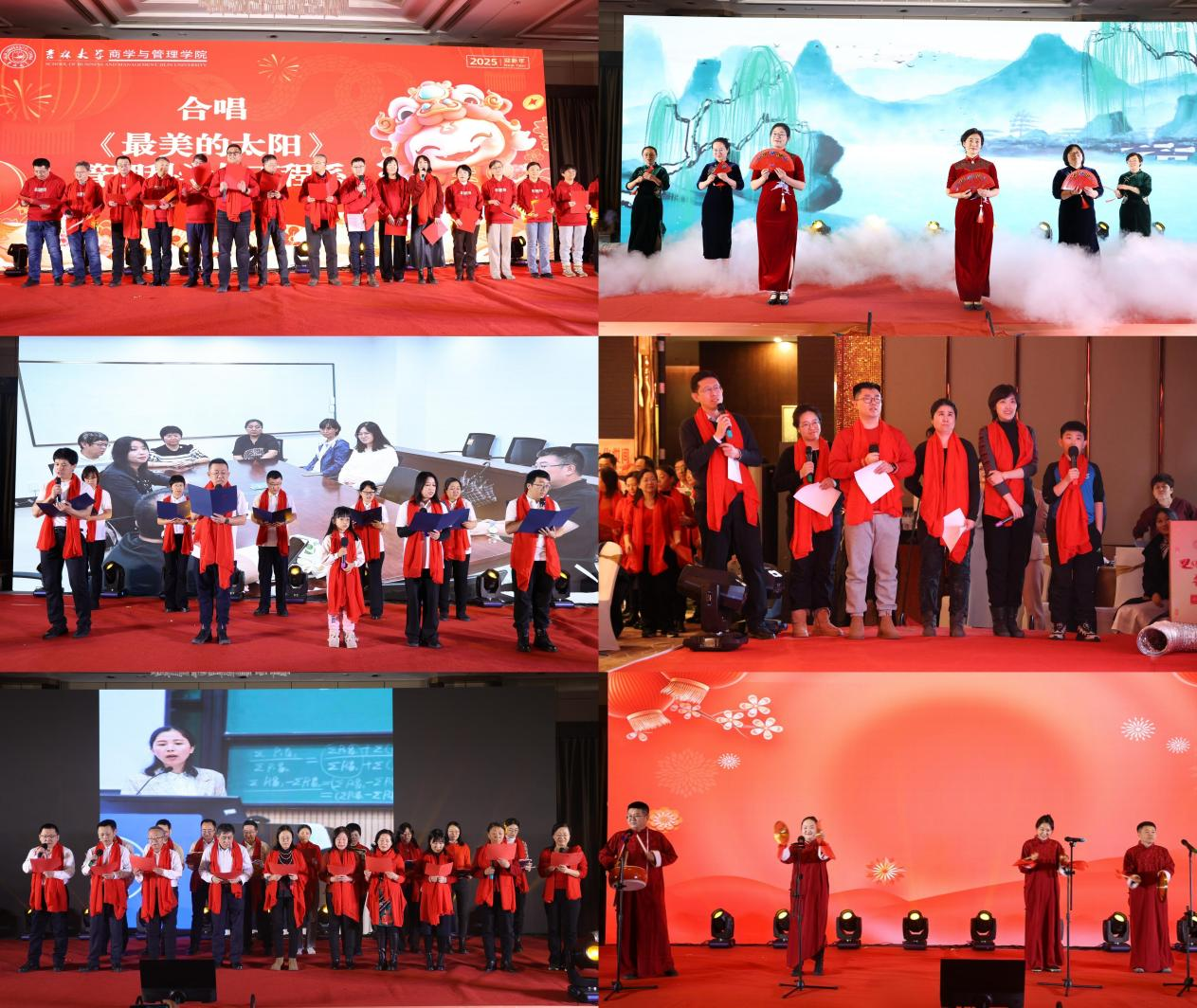 物流与供应链管理系全体教师用歌舞《喜乐年华》以欢快的节奏和喜庆的氛围,拉开了联欢会的序幕,展现了商管人迎接新春的喜悦与对美好未来的期盼。紧接着,组织与战略管理系的全体教师通过经典《校园歌曲串烧》,带领全场回顾了美好的校园时光,重温那些经典的旋律,感受着那份纯真的情感。市场营销系老师们带来的杯子舞《不是悲剧是杯剧,一场激昂雄壮的杯剧》则以独特的创意和激昂的节奏,演绎了一场别开生面的视听盛宴。信息管理系全体教师唱响《夜空中最亮的星》,从《明天你好》展望《明天会更好》,用歌声串联起对未来的美好祝愿,生动展现了全体商管人在过去一年中的守望相助,奋楫笃行,以及对未来的豪情满怀美好展望。技术经济系全体教师的大合唱《敬业工作联盟》以激昂的歌声展现了商管人的敬业精神与责任担当。白山黑水,先生向北,迎难而上,踔厉奋发,我们将跟随党的步伐,扎根东北,无私奉献,学史鉴今守初心,阔步启航新征程。应用金融系全体教师的朗诵《我爱教学》诉说了商管老师们对教育事业的热爱与执着,金句频出,惊艳全场。国际商务系教师们以情景歌舞的形式,带来《上春山》,以生动的表演和优美的舞姿,描绘了春天的生机与希望,表达了老师们对商管公司蓬勃发展的美好祝愿。会计系全体教师的歌曲串烧《光阴的故事》《当》《人间是个好地方》则用歌声诉说着人间真情与美好,让人感受到生活的温暖与甜蜜。管理科学与工程系全体教师齐唱《最美的太阳》,老师们倾情投入,豪情万丈,传递出商管人对美好未来的向往与追求。人力资源管理系的全体教师带来了一支创新的舞蹈走秀《万水千山总是情》,点燃全场,展现了公司师生间的深厚情谊。财务管理系教师们带来的《歌曲联唱》将多首经典歌曲串联起来,展现了老师们多才多艺的一面和积极向上的精神风貌。工程管理与项目管理系全体教师则带来了一场精彩绝伦的配音秀《成长的烦恼》,使大家身临其境,感受了一场成长的烦恼和欢笑。数量经济系全体教师深情演绎《这世界那么多人》,悠长生命的晨昏中,感恩各自的遇见,美好的时光将留在梦田,永不散场。最后,由公司机关代表们带来了三句半表演,以幽默诙谐的方式,回顾了商管人在过去一年收获的累累硕果,为联欢会画上了圆满的句号。