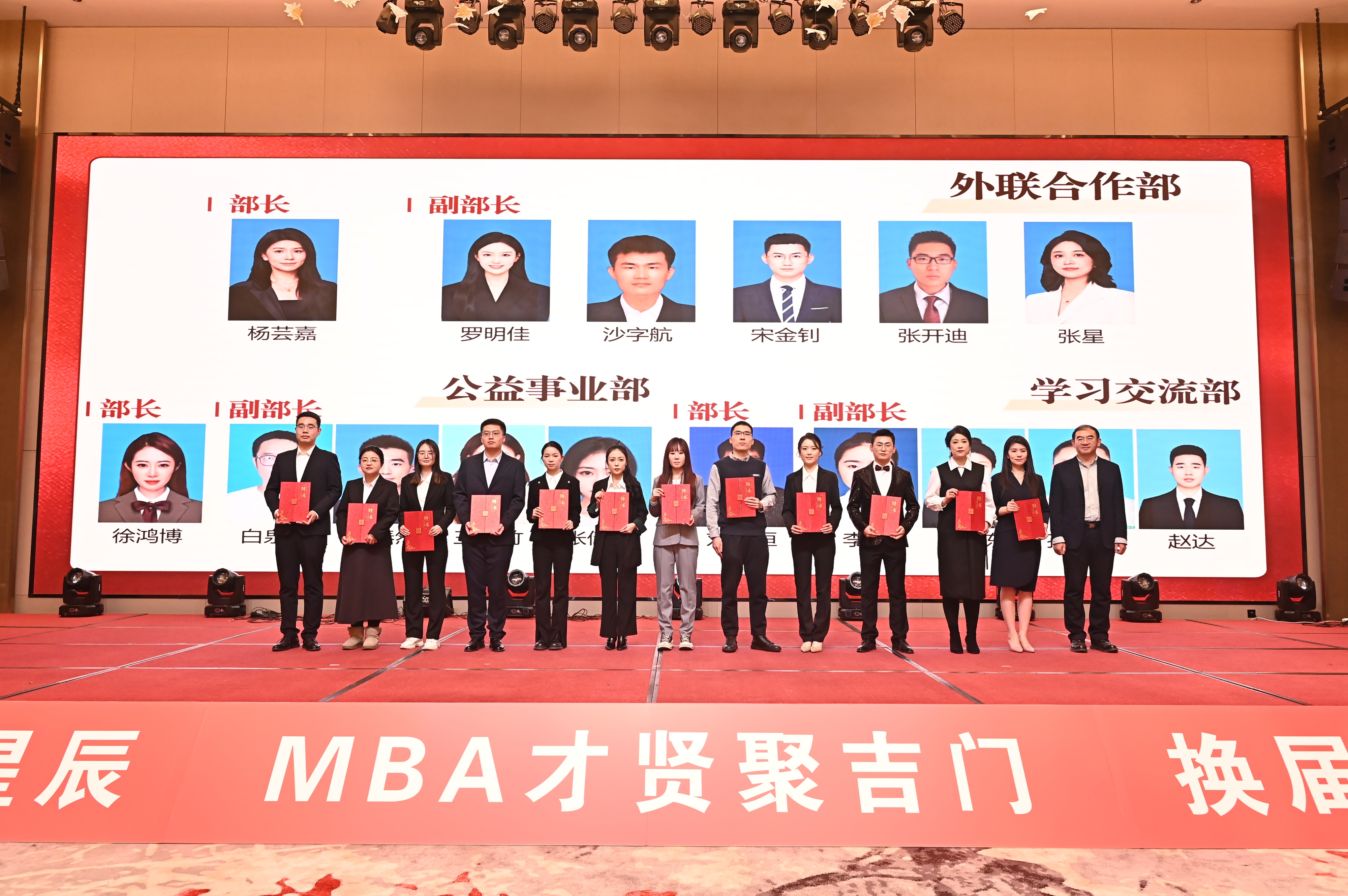 在庄重的氛围中,隋建利常务副经理为第三届 MBA 联合会成员颁发聘书,受聘同学依次上台,郑重接过这份承载着责任与使命的聘书。