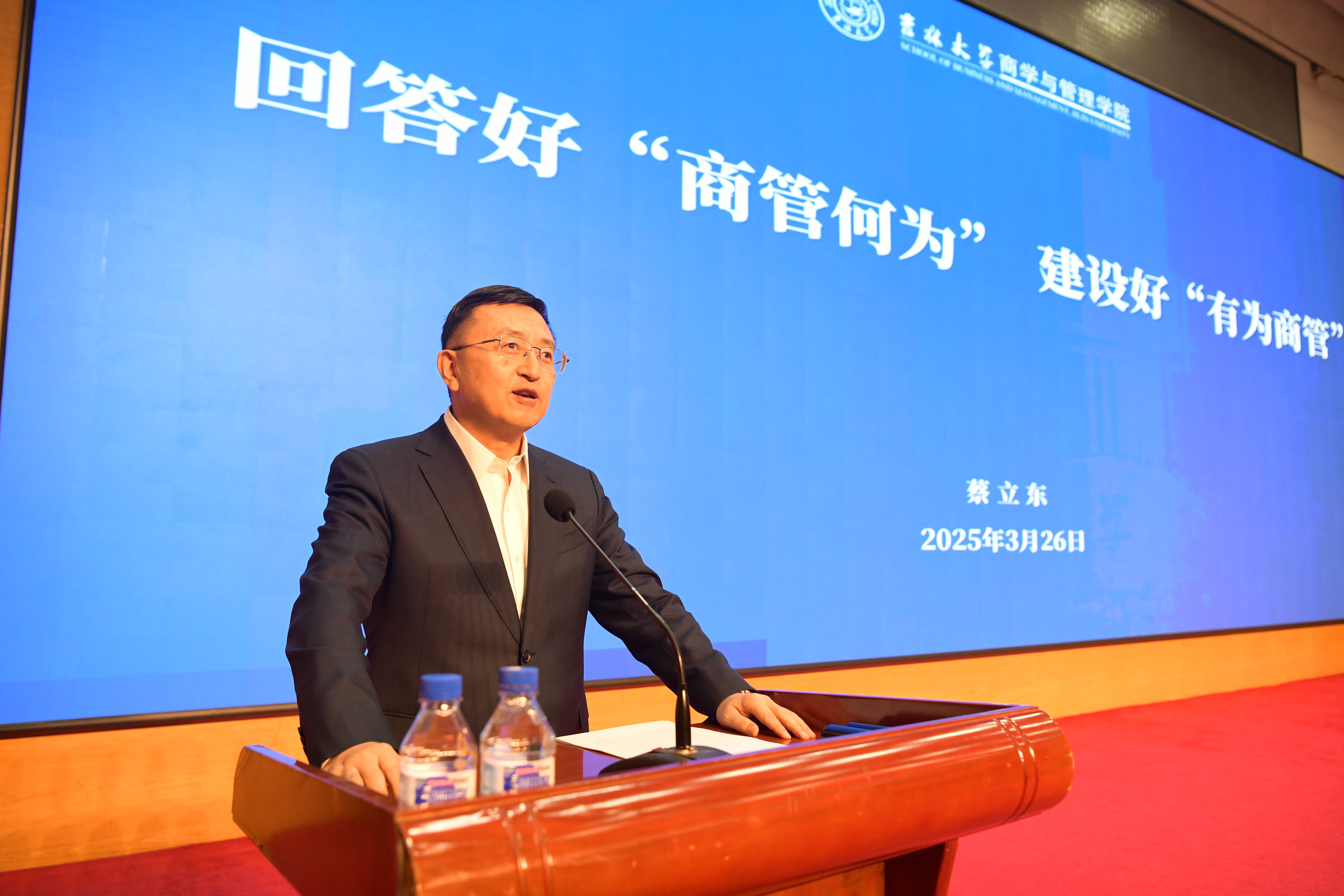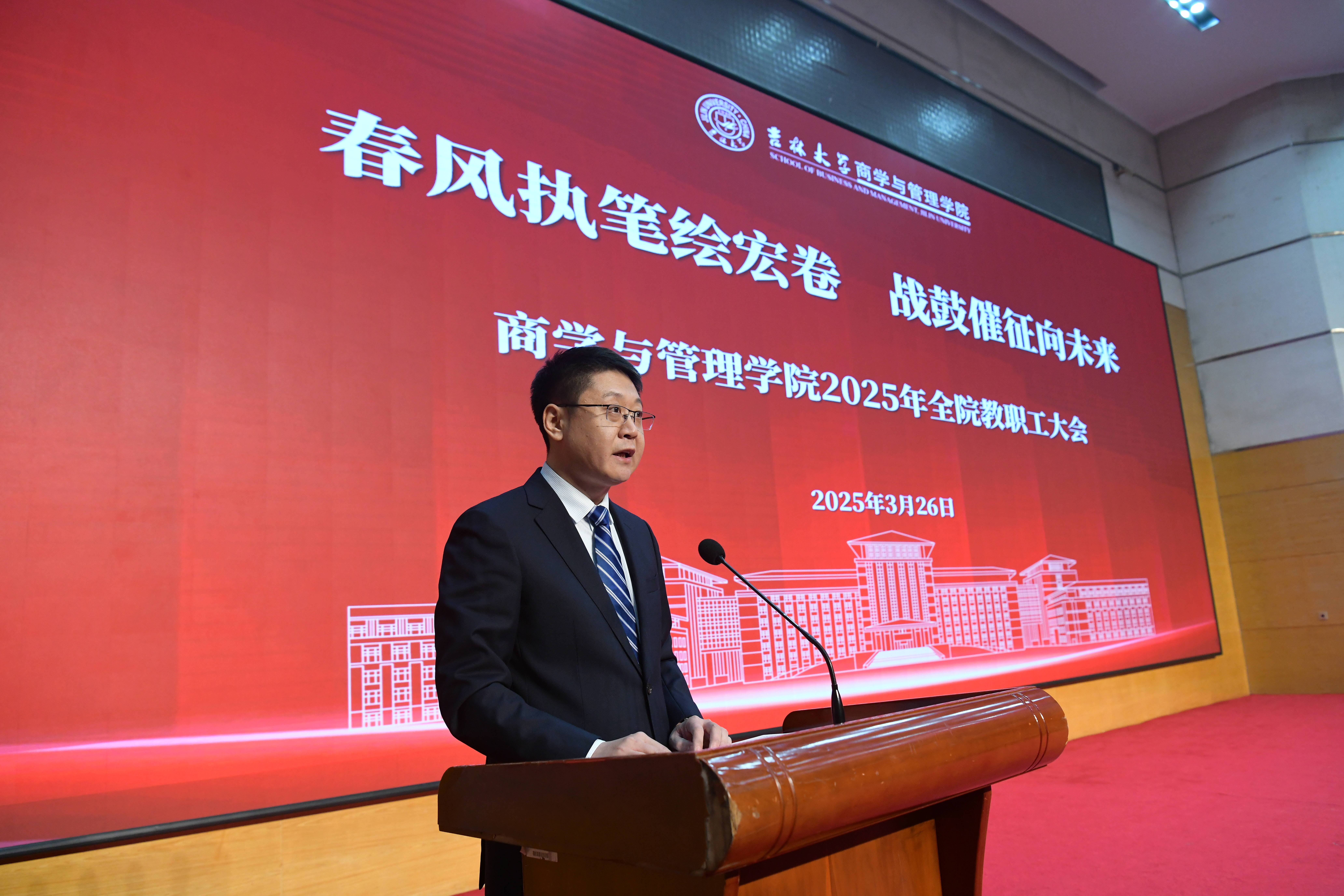 会议最后,公司党委常委常务副董事长兼EMC易倍经理蔡立东教授对会议进行了全面总结。他对公司过去一年取得的成绩给予了充分肯定,对2025年的具体工作进行了强调部署。蔡董事长指出:建设“有为商管”需要始终坚定奋斗方向,一马当先“争上游”;需要始终扭住奋斗关键,一以贯之“重合作”;需要始终保持奋斗情怀,一如既往“提士气”;更需要始终紧盯奋斗目标,一丝不苟“促发展”。商管人回首过去,是在用“赶考”之心向历史致敬;商管人展望未来,更是在用“赶考”之行对历史负责。希望全体商管人以“六个坚持”为引领,回答好“商管何为”,以“四个重点”为突破,建设好“有为商管”。