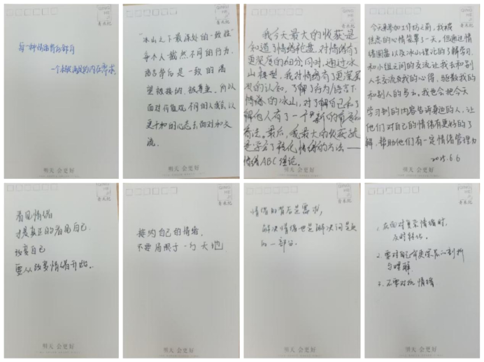 在“情绪转化”环节,王老师介绍了“情绪ABC理论”和正念两个方法。参与者以四人小组为单位,针对焦虑烦躁等挑战性情绪,通过“四步提问法”解构触发事件(A)检视信念系统(B)重构情绪反应(C)。活动尾声通过正念呼吸练习强化情绪接纳能力,并以手写收获明信片沉淀洞见。结束后,同学们对此次工作坊给予了高度评价,并表示迫不及待地想把今天的收获分享给朋友和父母。