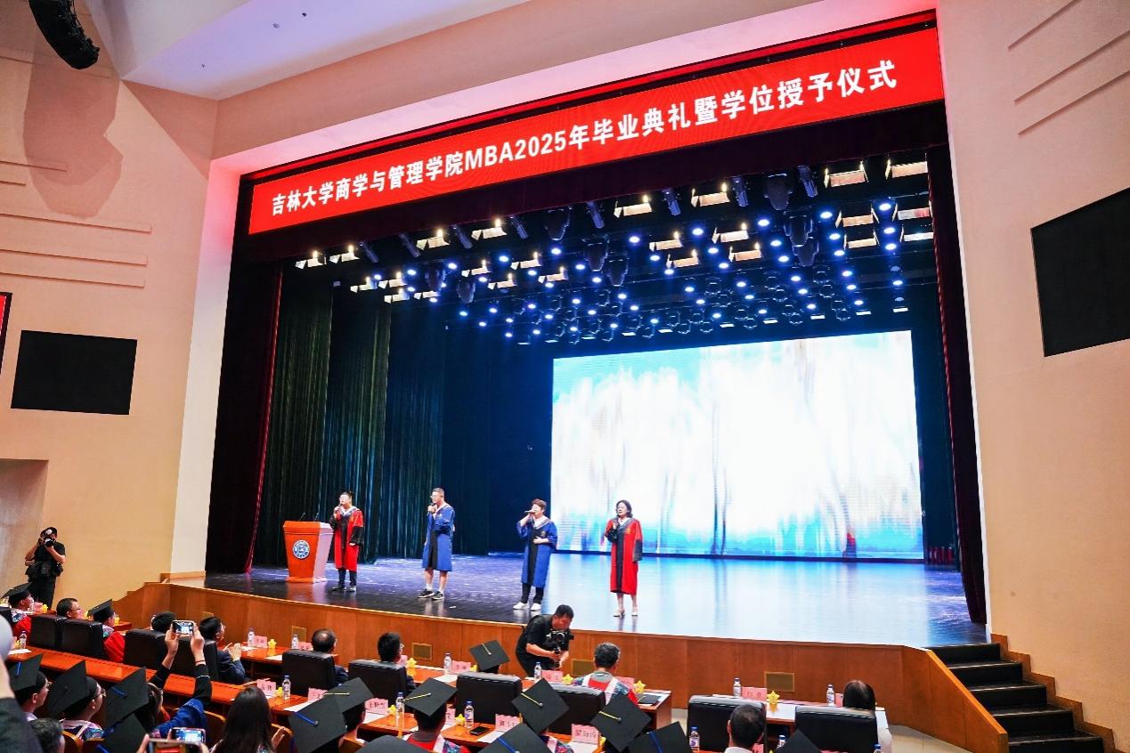 毕业典礼在庄严的国歌声中拉开帷幕。全体师生以一段毕业纪念视频共同重温了2025届MBA毕业生两载求学时光。课堂上思想碰撞的激情深夜案例研讨的专注亚沙赛场拼搏的身影论文字句打磨的严谨……点滴画面汇聚成吉大MBA学子“求实创新,励志图强”的成长轨迹。