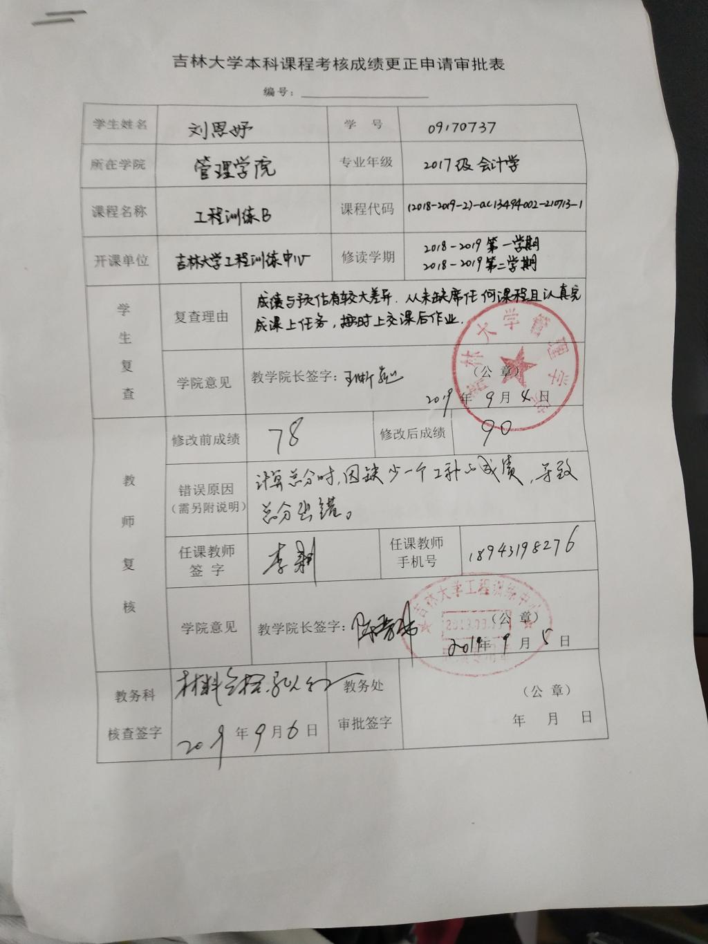 根据《关于进一步明确本科生课程考核等有关问题的通知》(校教字〔2018〕47号)文件有关精神,现对管理公司2017级刘恩妤同学(学号:09170737)2018-2019-12学期课程成绩更正如下: