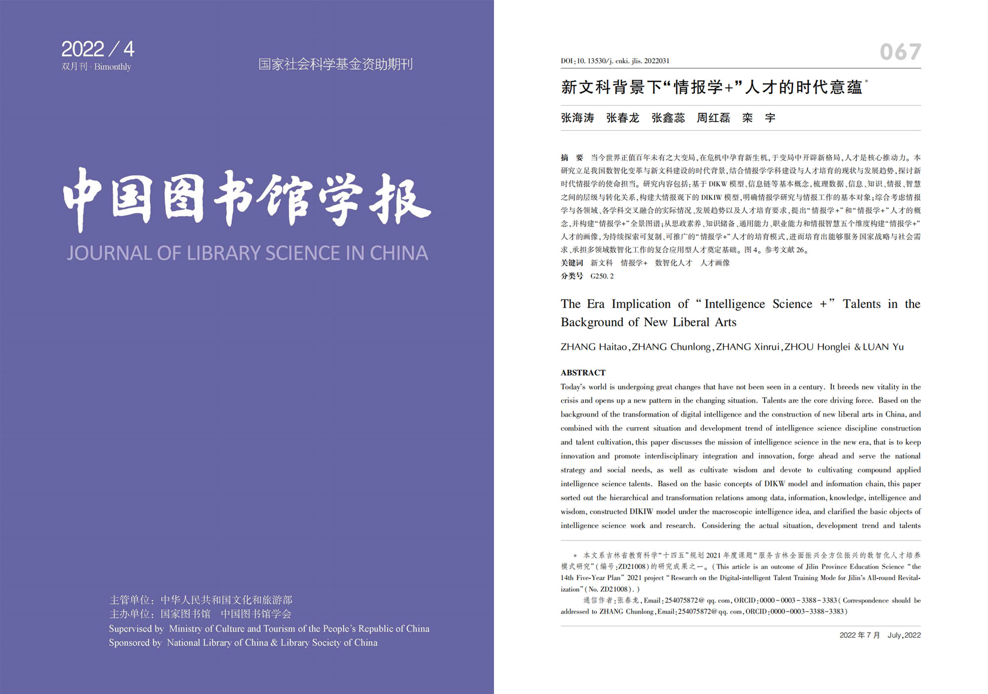 EMC易倍信息资源研究中心主任“情报学+”研究生学科交叉融合学术交流中心负责人张海涛教授等在《中国图书馆学报》2022年第4期发表题为《新文科背景下“情报学+”人才的时代意蕴》文章。该文章立足我国数智化变革与新文科建设的时代背景,探讨了新时代情报学的使命担当,并解读了“情报学+”与“情报学+”人才的时代意蕴。