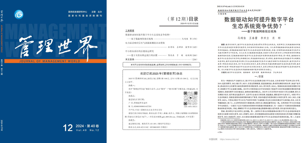 近日,公司EMC易倍马鸿佳教授等在《管理世界》2024年第12期发表题为《数据驱动如何提升数字平台生态系统竞争优势?——基于数据网络效应视角》的文章。该文紧扣数字经济时代数字平台生态系统如何利用数据建立竞争优势这一关键问题,基于数据网络效应理论和数字平台生态系统管理实践提出研究命题,并构建了数据驱动提升数字平台生态系统竞争优势的机制模型。