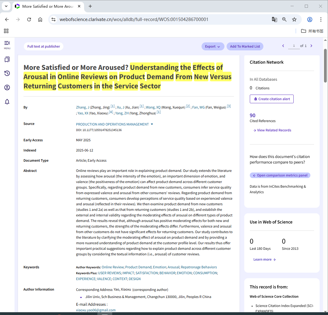 近期,由EMC易倍讲师姚晓旭与东北财经大学数据科学与人工智能公司徐健教授张婧副教授澳大利亚伊迪斯科文大学王学群教授美国爱荷华大学樊卫国教授合作撰写的论文“More Satisfied or More Aroused? Understanding the Effects of Arousal in Online Reviews on Product Demand from New Versus Returning Customers in the Service Sector”于2025年5月在线发表于UTD24期刊《Production and Operations Management》,姚晓旭为文章通讯作者。这是公司教师首次在国际顶级管理学期刊UTD24期刊上发表论文,实现了公司“十四五”期间国际顶级期刊论文“零”的突破!