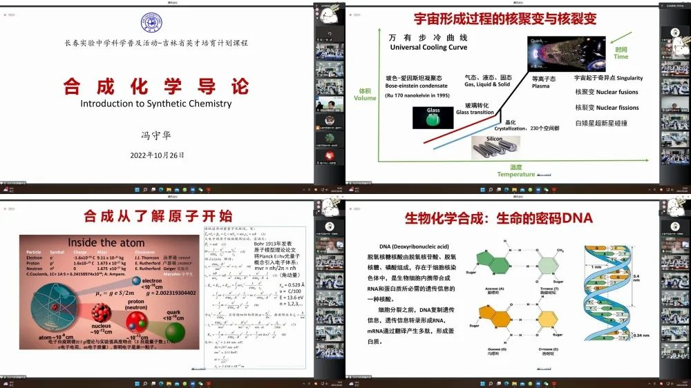 冯院士为云端师生带来了题为《合成化学导论》的科普报告,围绕合成化学的范畴合成反应机制和合成控制因素三个方面展开,冯院士重点介绍了合成化学在现代的应用,如GPS系统的原子钟芯片技术中单晶硅的掺杂等。最后,冯院士教导同学们要厚植爱国情怀树立远大理想,夯实今日,创新未来,在科技领域为祖国贡献自己的青春力量,创造属于自己的无悔人生。