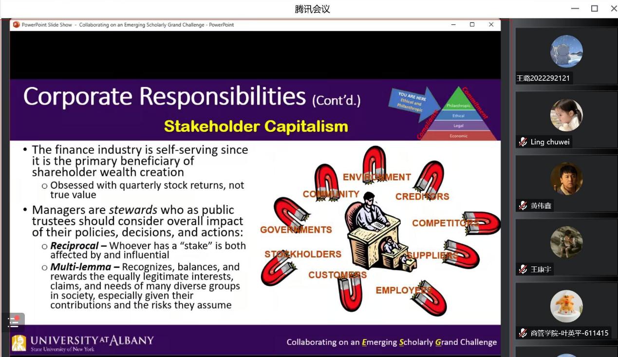 讲座过程中,Paul 教授与师生们进行在线互动,Paul教授发起了一项在线调查,以了解参会的同学们对ESG和企业责任的认识。随后Paul Miesing教授以GovernanceSocialEnvironment的顺序为大家介绍了ESG,并介绍了代理理论,资源依赖理论,机构理论等相关的理论。