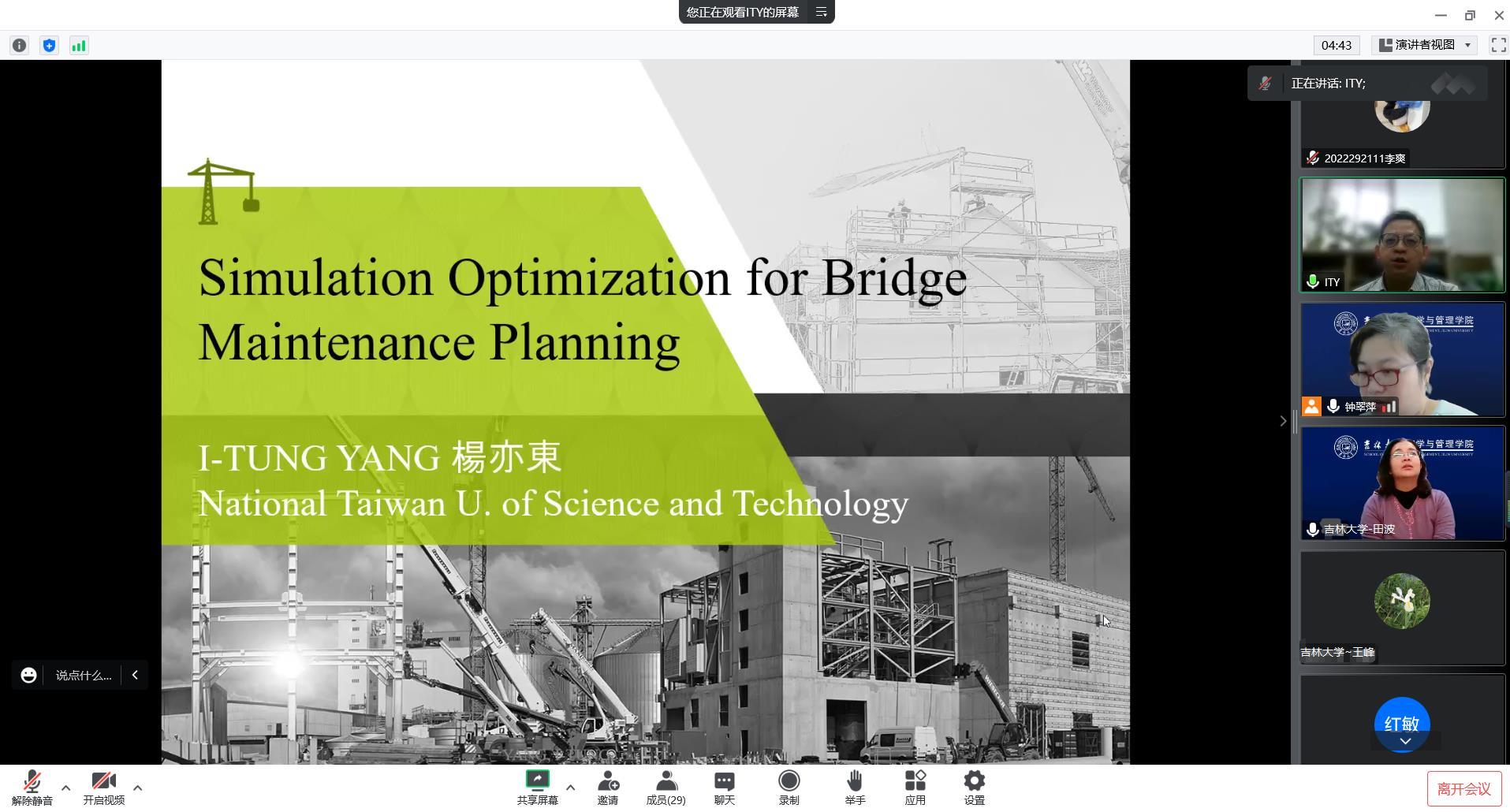 2022年10月28日下午,公司邀请到了来自台湾科技大学营建工程系的杨亦东教授作主题为《Simulation Optimization for Bridge Maintenance Planning》的线上学术报告。本次会议由EMC易倍钟翠萍教授主持,EMC易倍工程项目管理系的师生共同参加了此次报告。杨亦东教授毕业于美国密西根大学安娜堡校区,多年深耕于工程管理计算智慧决策与风险分析以及离散事件模拟研究领域。目前,杨教授担任韩国土木工程学会学刊副总编辑中华台北亚太工程师暨国际工程师监督委员会主任委员中国土木水利工程学会信息委员会主任委员国家科学及技术委员会土木工程学门审查委员,以及逾40本国际期刊审稿委员。