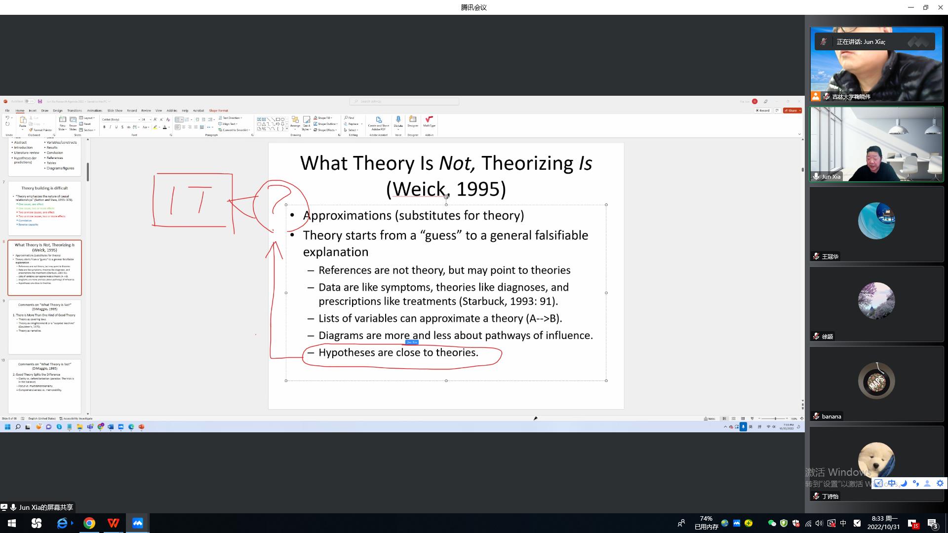 第二场讲座题目为“Theory and empirical test”。本次讲座围绕“Theory construction as social construction”的主题展开。夏军教授以具体论文为例,介绍了理论应该具备如下的特征:“covering laws”“enlightenment”“narrative”,这样才能够更加吸引读者。此外,夏军教授还认为好的理论应该具有“clarity vs defamiliarization”“focus vs multidimensionality”“comprehensiveness vs memorability”“the value of resonance”“slogan”“post hoc”等特征,并围绕每种特征一一展开了讨论。