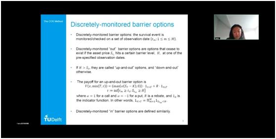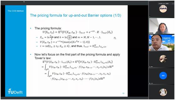 第三十一场讲座由EMC易倍应用金融系承办,邀请到了荷兰代尔夫特理工大学应用数学系方芳博士进行分享交流。讲座由应用金融系刘洋副教授主持,应用金融系的教师研究生及本科生等30余人参加了本次讲座。方芳博士带来的讲座题目是“The COS method for pricing Barrier and Bermudan options”。作为COS方法的提出者,方芳博士将其基础科研成果持续扩展,特别是在金融衍生品定价领域不断取得突破。本次报告延续上次讲座的科研方向,聚焦方芳博士在两种不同类型期权产品方面的研究进展,同样以金融产品的数理模型为基础,以计算金融算法的设计与实现为核心,清晰地展示了COS方法在期权定价的规范应用。本次报告的技术性很强,启发了相关领域的研究思考,也为同学们强化了金融市场知识掌握。