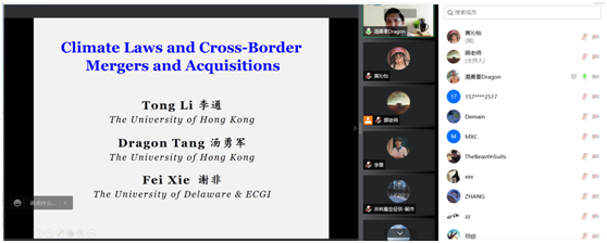 第一场讲座的主题为“绿色金融的监管规范市场发展和学术研究”。汤教授首先介绍了近期各国面临的主要问题,继而引出中国对气候问题的关注。紧接着,汤教授列举了全球主要国家纷纷提高对ESG重视程度的实例,以及ESG在各国的最新发展近况。最后汤教授为师生汇报了他近期完成的论文“Climate Laws and Cross-Border Mergers and Acquisitions”。讲座结束,汤教授与参会师生进行了深度互动,围绕“碳中和与经济增长”“ESG评价指标的选取”等问题展开交流。
