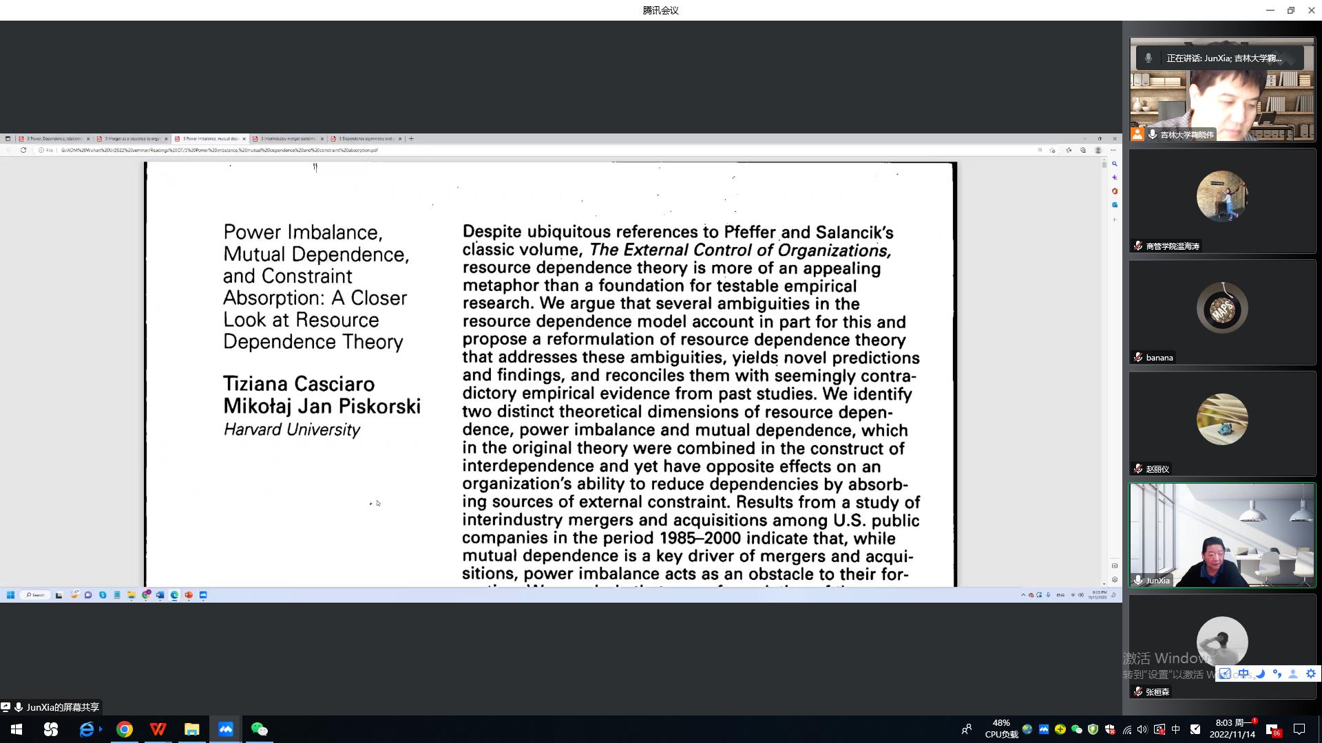 第一场讲座题目为“Resource dependence theory”。首先,夏教授介绍了Resource Dependence 和Power 的关系,Dependence 产生于 Exchange关系,以及Dependence 的两个基本定义,即motivational investment 和 Inversely proportional to availability。夏老师以自己在SMJ发表的一篇文章为例,讲解了这个概念在文章撰写中具体的应用,即A发生的行为对A与B关系的影响。Power的概念是:A让B做B不愿意做的事情。Dependence 与 Power大小相同方向相反。此外,讲座说明了增加Power的4种方式。最后,夏教授讲解了A与B之间由于 Dependence 和Power 会发生的事情:Mergers/acquisitions, Joint ventures/alliances, Boards/interlocks, Political Action, Executive succession。 Dependence 导致 Acquisition (Absorption)。本次讲座为师生们提供了非常有益的思考,在场师生对该理论有了进一步的领会。
