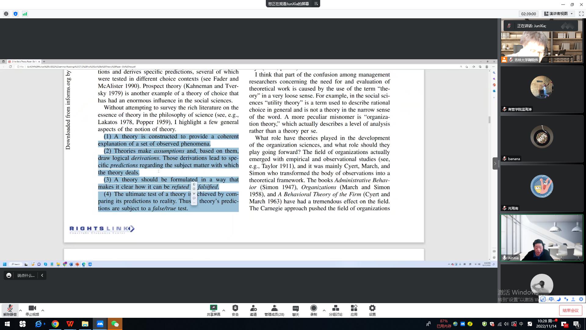 第二场讲座题目为“Power”。夏教授介绍了理论的两种表达方式:即数学语言讲故事,以及理论的三个层次四个严谨的方面。理论是对观察到的现象的因果关系的解释。理论需要 AssumptionDeviation和Prediction。如果写文章,最可能做到的就是去“攻击”其他文章的 assumption。夏老师以自己的文章为例讲解了如何针对其他论文的假设进行“攻击”写作论文,如stakeholder signal,并作为文章的贡献。另一篇文章是 structural holes 与 power信任结合的例子。在美国,Power会使得员工得到提拔,但在中国却是一个负的结果。同样的研究内容,但在不同国家,结果是不一样的。原因在于 assumption不一样。最后,老师和同学们针对讲座内容提出了一个倒“U型”与线性调节的问题,夏老师给予了耐心的解答和详细的讲解。本次讲座极大地开阔了同学们的科研视野,得到了在场师生的一致好评。