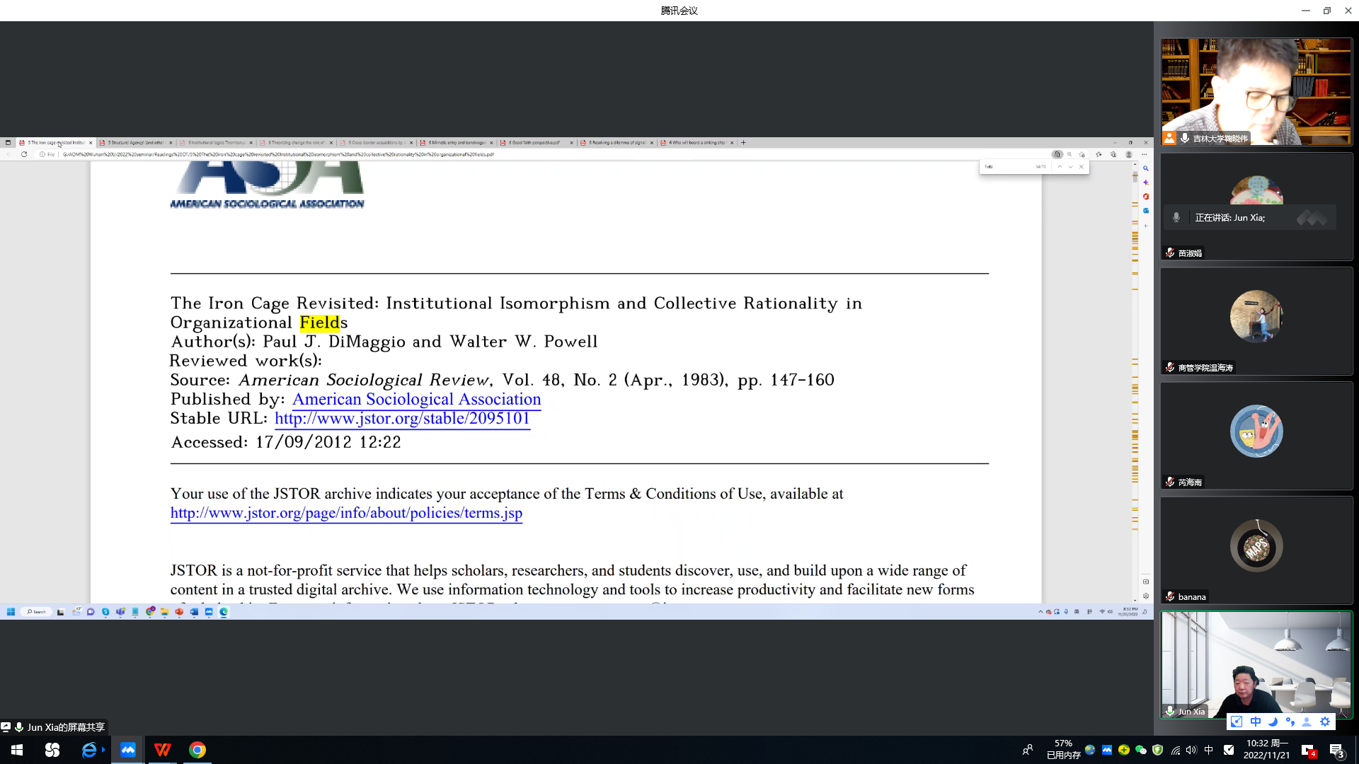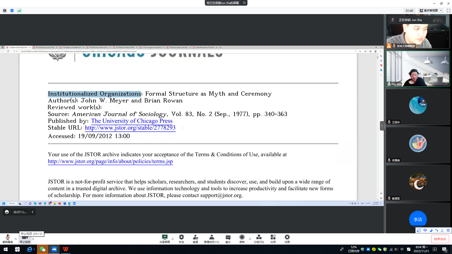第一场讲座题为“Institutional theory: isomorphism”讲座。讲座主要围绕“Institutional theory: isomorphism”的主题展开。首先,夏军教授介绍了制度理论的来源,以及制度化组织的含义,即采用外来结构要素的组织。文章中常见的Formal structure也是采用外来某种方式的组织。比如,Rationalized institutional rules是组织采用其他组织的惯例,然后使其成为合法性的一部分,对外部显示出它是合理的。此外,检验制度理论需要检验数量sheer number。例如,以Tolbert和Zucker(1983)这篇文章为例,在Diffustion的过程中,如果企业强行采用,那么过了40年,制度化会达到100%;如果企业自愿采用,那么过了50年,制度化会达到60%。在社会现代化过程中,也会产生很多新的制度要素,企业也会采用这些要素。比如,中国私有制的diffusion。最后,夏军教授介绍了制度改革的六个阶段:precipitating joltsdeinstitutionalizationpre-institutionalizationtheorizationdiffusion和re-institutionalization。