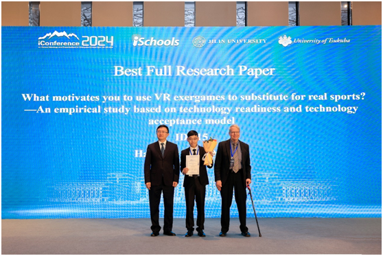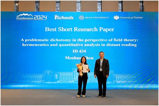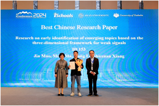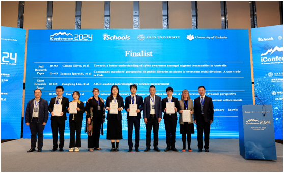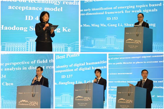 致辞结束后,进入最佳论文颁奖环节。会议评选出最佳长论文一等奖1项,最佳长论文二等奖1项,最佳长论文入围奖3项,最佳短论文一等奖1项,最佳短论文二等奖1项,最佳短论文入围奖3项,最佳中文论文奖1项,最佳中文论文入围奖4项,最佳海报一等奖1项,最佳海报二等奖1项,最佳海报入围奖3项。iConference 2024长论文主席马捷iConference 2024中文论文主席张洋iConference 2024短论文主席Masanori KoizumiiConference 2024大会主席Atsuyuki Morishima与郭英彤分别宣读了获奖名单。