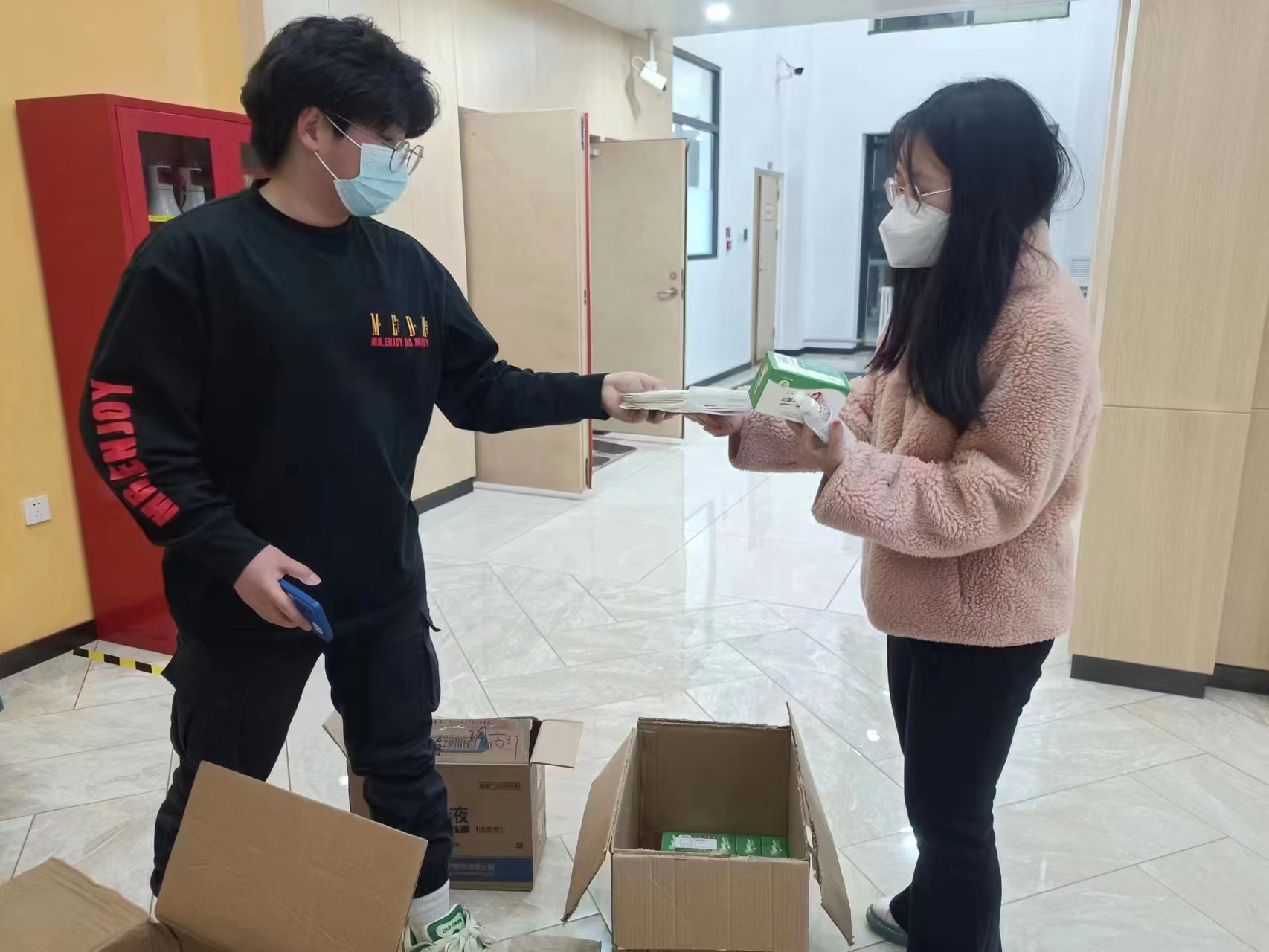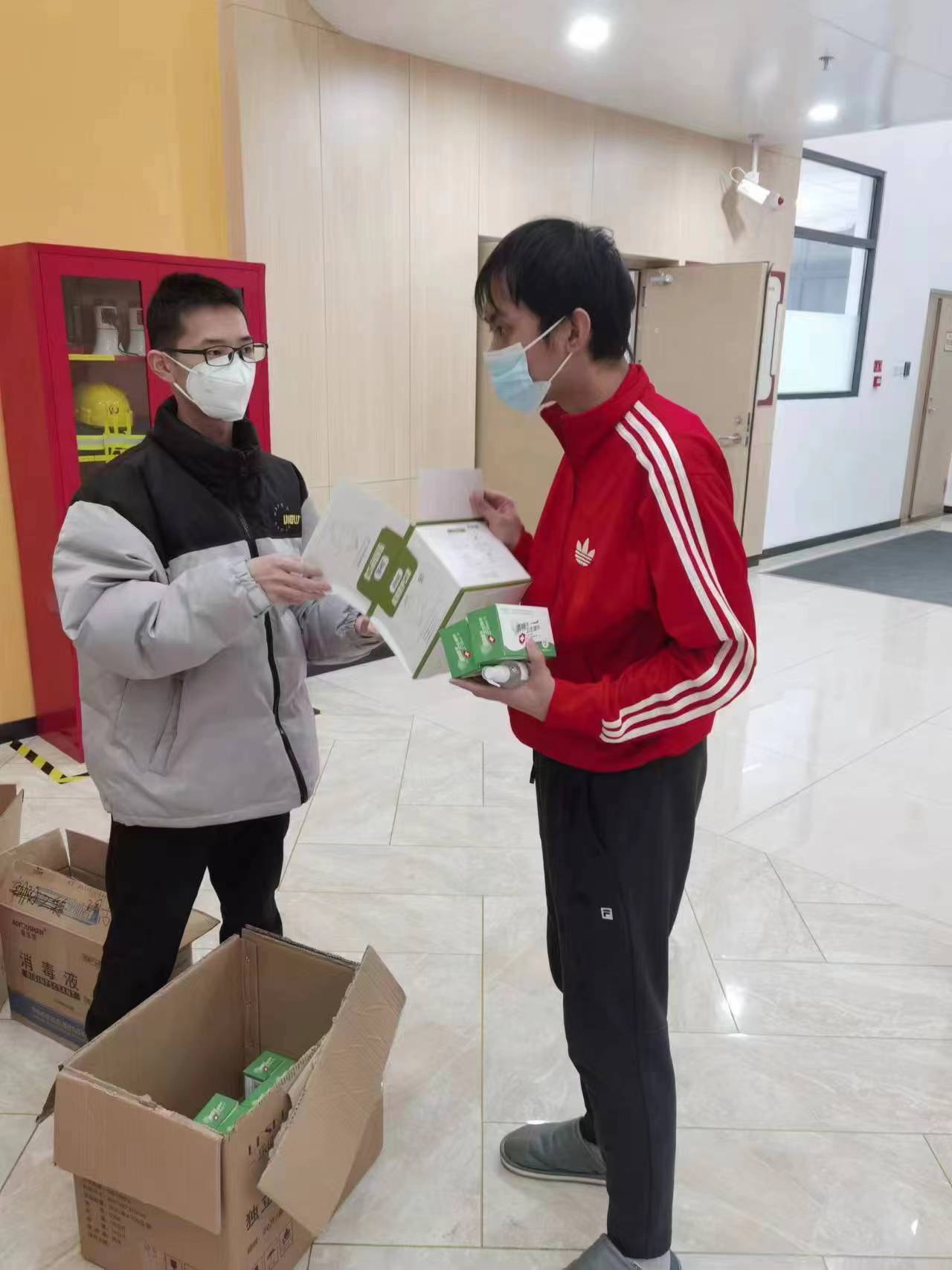 社会当前疫情形势严峻,在了解到社会外备物资稀缺购买困难,而在校同学疫情环境不稳定的情况后,副董事长蔡立东党委书记赵军等公司领导老师在第一时间联系了社会各企业医院及药店,积极沟通协调,购买口罩消杀用品等疫情防控重点保障物资,极力保障在校员工的防疫物资需求。公司上下齐心协力全力配合。经多方筹措,公司成功为在校员工筹措防疫物资,共筹集N95口罩4000余个酒精喷雾800余瓶消毒湿巾800余包。并逐一分发至各学子手中。