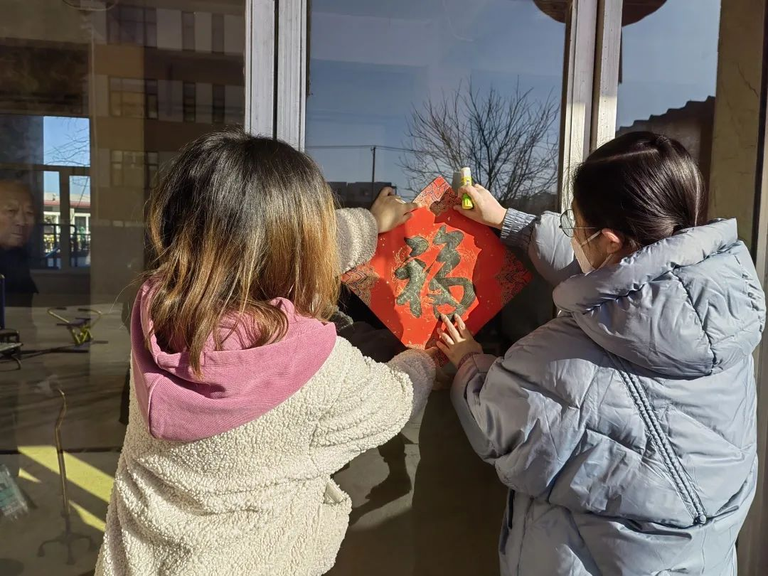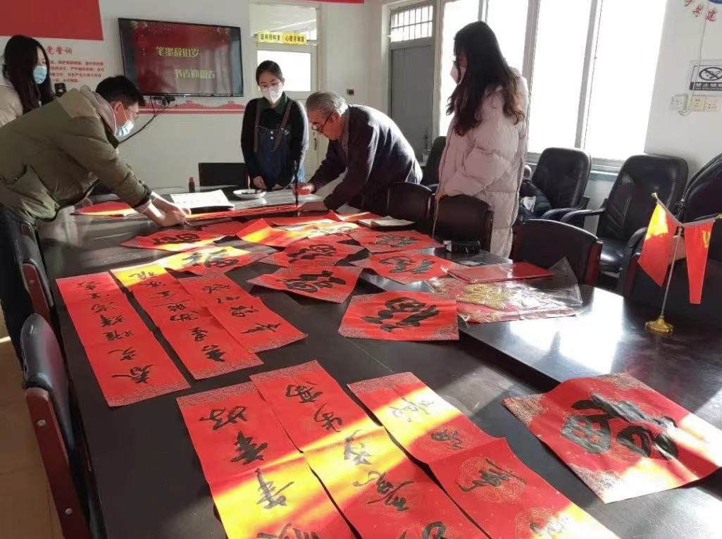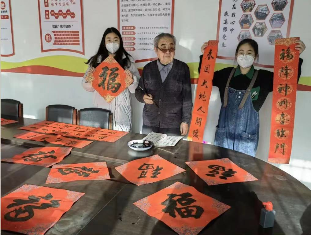 活动期间恰逢春节,为了更好地营造年味,团队成员特地在社区工作人员的协助下开展了“笔墨辞旧岁 书香迎新春”活动,邀请了年过七旬的老党员李爷爷为大家书写福字和春联。活动现场,李爷爷认真而专注地挥毫拨墨,大红的春联喜气洋洋,浓浓的年味浓缩于一笔一画之间,将新年祝福倾注于喜庆的春联纸上。团队成员把这些饱含祝福的春联和福字送到社区空巢老人的手中,和老人一起贴春联,与老人亲切交谈,详细了解老人的生活情况困难和需求,叮嘱老人要注意身体,保持身心愉快,喜迎新春佳节。