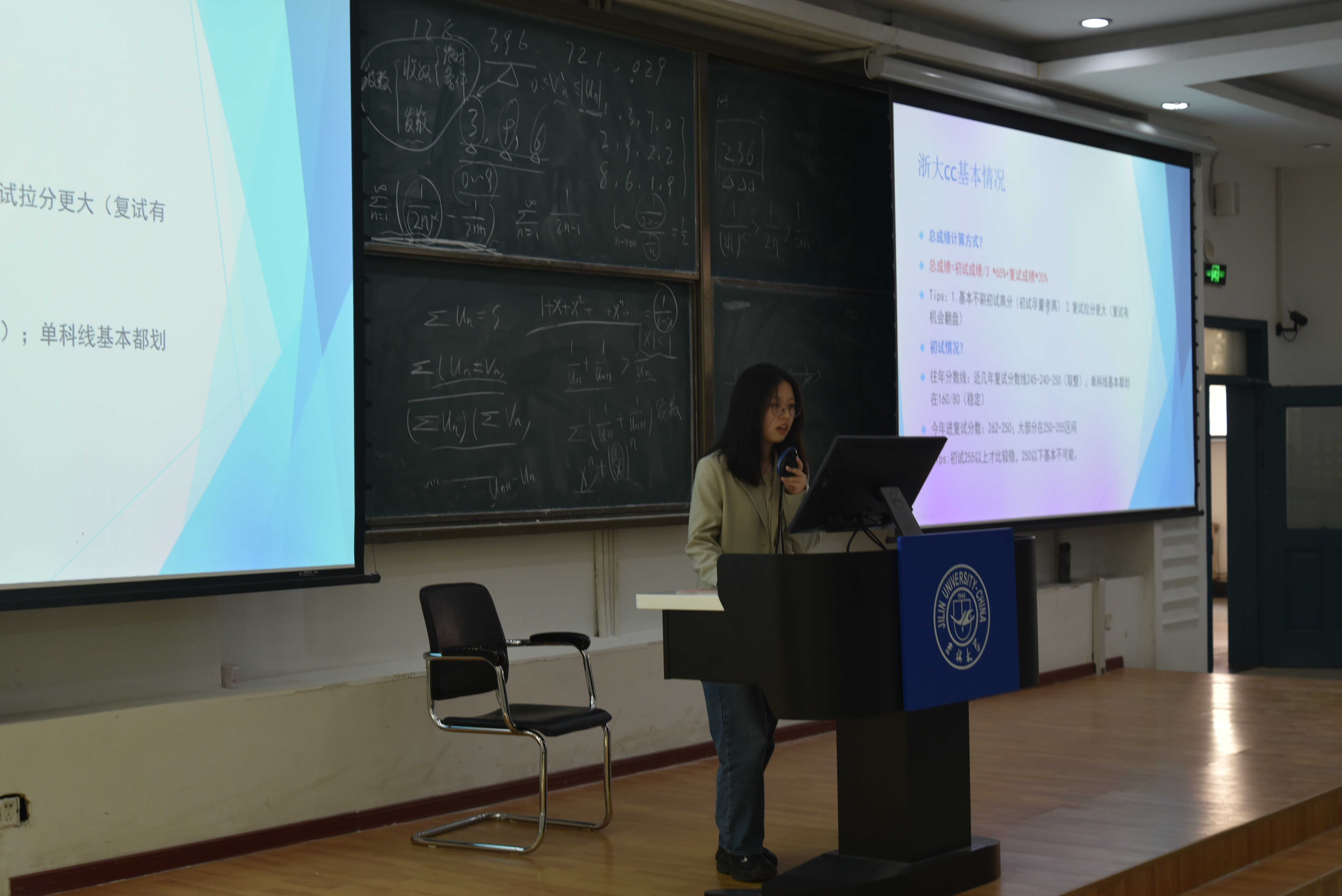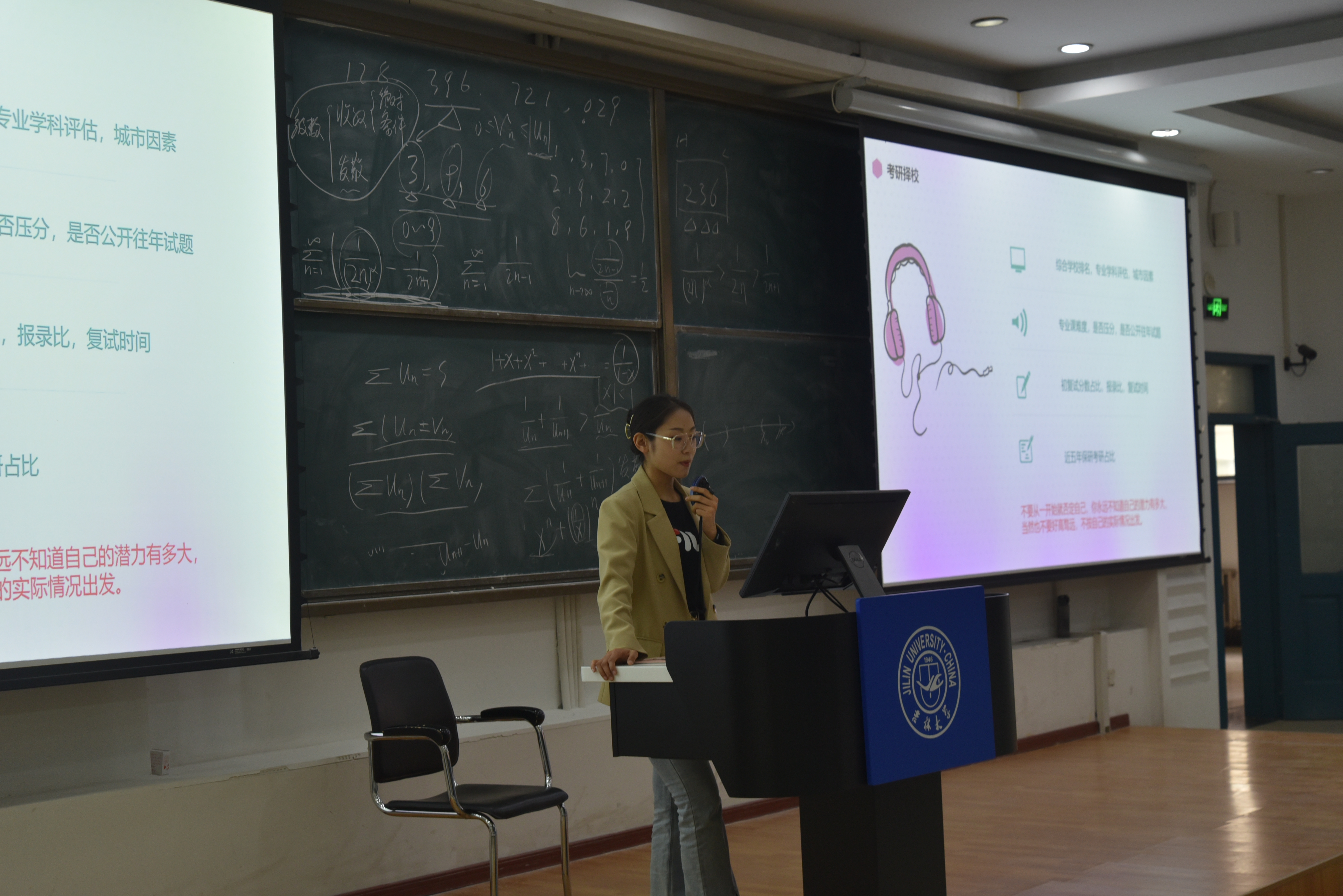 首先进行分享的是会计学的宋茗慧,学姐从自身背景考前规划与准备和初始备考指南三个方向进行了介绍。宋茗慧学姐以自身亲身经历向大家传授了自己的备考心得,尤其在选校建议和落实考研计划两个方面多次强调,希望同学们提高重视程度。