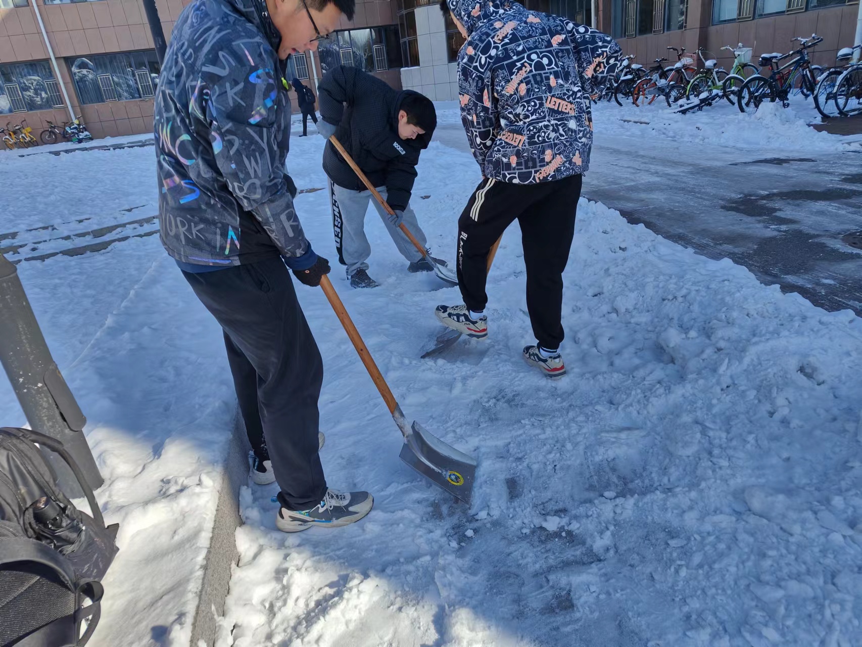 为快速清除路面积雪,保障校园路畅通,大家齐心协力,推铲扬堆,各种方法齐上阵,为全校师生开辟一条条洋溢着暖暖温情的方便之路。教师和员工们在白雪皑皑的世界里,热火朝天的清扫大雪,员工们通红的脸颊彰显着劳动的风采。尽管同学们的脸冻得通红通红,但大家手中的扫雪工具却一刻都没停,在欢声笑语中扫出了畅通的大道,消除了大雪天气导致的安全隐患,为师生的安全出行提供了方便。