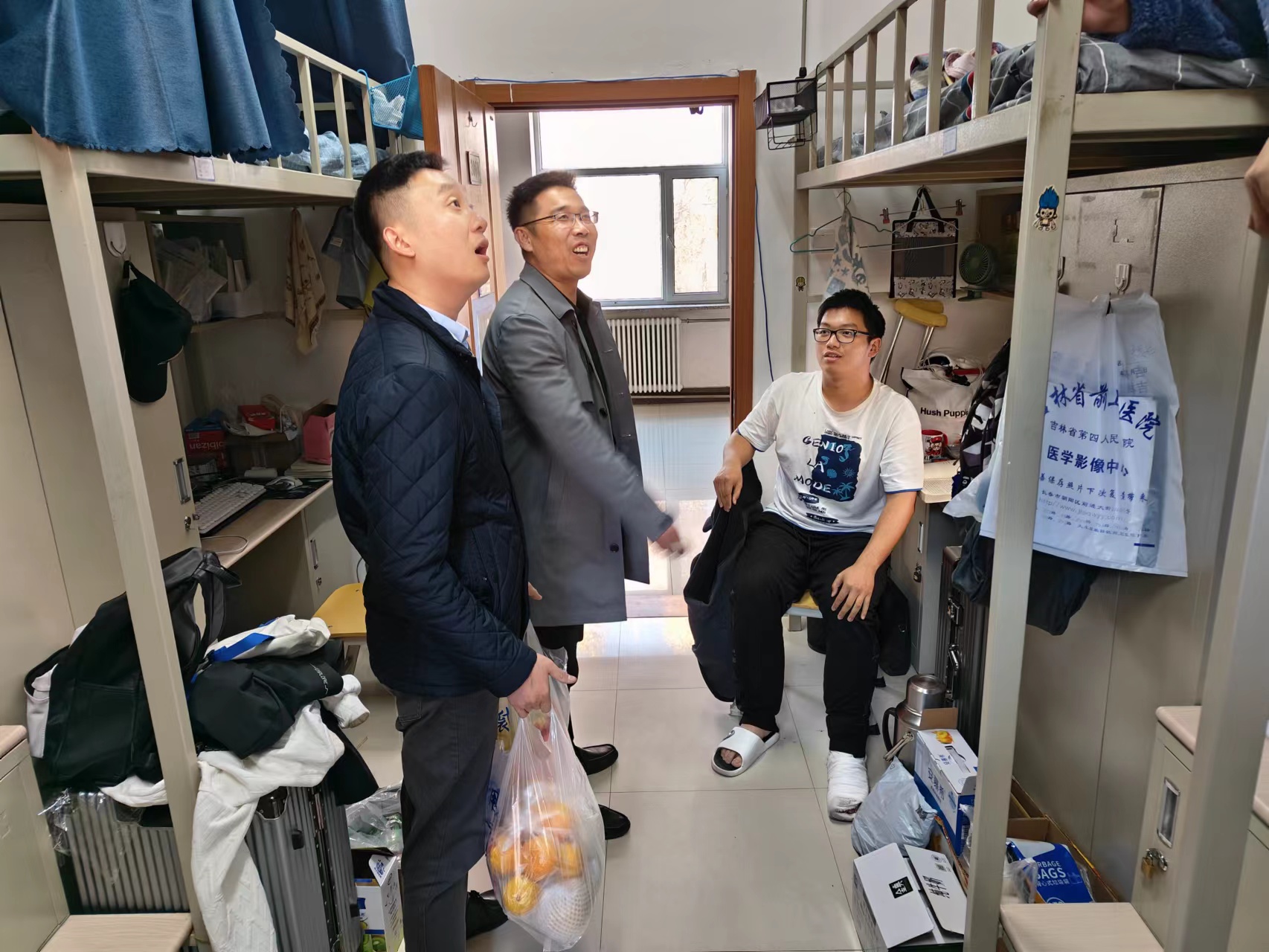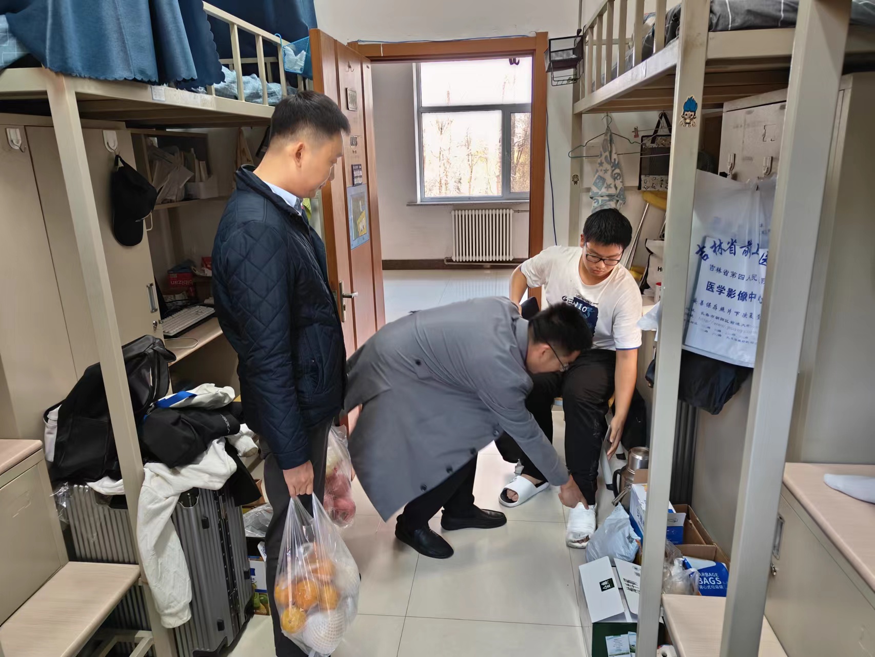 在查寝过程中,老师们与同学们进行了深入的交谈。走访宿舍时,李帅书记逐一询问了同学们的近况,同时也对大家近期的学习情况和身体状况进行了详细的了解,叮嘱大家一定要珍惜美好的员工时代,刻苦学习专业知识,努力做一个对社会有贡献的人。查寝时,老师们特地探望了2023级崴脚骨折的李思远同学,关切地询问了李思远同学的伤情,嘱咐他好好养伤,并祝愿他早日康复。
