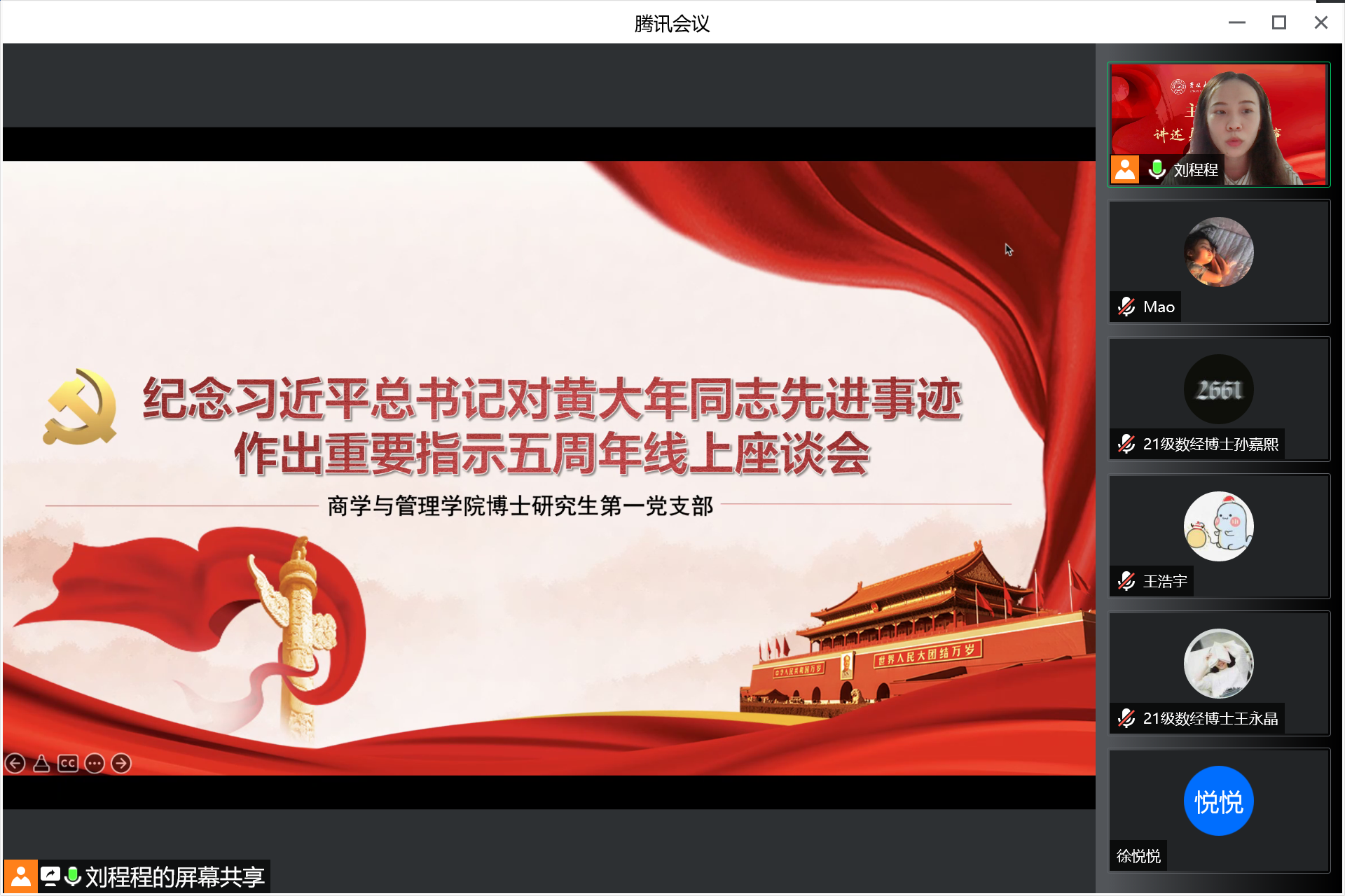 “纪念习总书记对黄大年同志先进事迹作出重要指示五周年”线上座谈开始,支部书记对黄大年同志的先进事迹进行了介绍,对黄大年精神的内容进行了讲述,并强调“心有大我,至诚报国”的爱国情怀是黄大年精神的本质特征,“教书育人,敢为人先”的敬业精神是黄大年精神的集中体现,“淡泊名利,甘于奉献”的高尚情操是黄大年精神的厚重底色。而后同学们共同观看了《黄大年》系列纪录片,回顾了黄大年同志归国七年以来夜以继日忘我工作的奋斗历程,在纪录片中黄大年同志身边的人对黄大年同志事迹的讲述中,全体同学被黄大年同志那颗爱国担当敬业奉献的赤子之心深深打动。