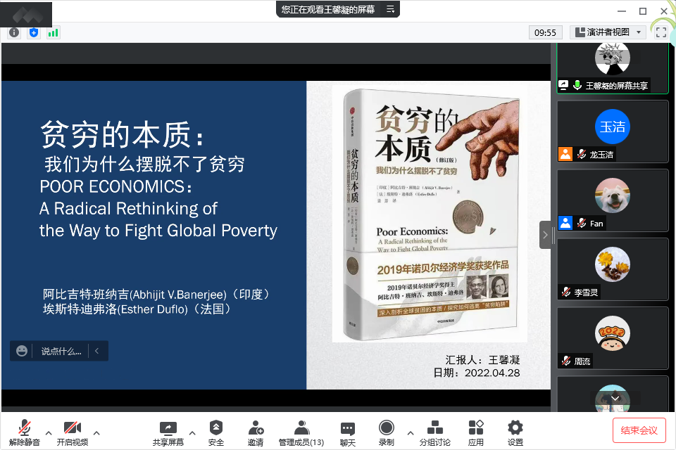 会议伊始,王馨凝同学围绕2019年诺贝尔经济学奖获得者阿比吉特·班纳吉[印]与艾丝特·杜芙若[法]合著的《贫困的本质》一书讨论分享了关于如何看待全球贫困的问题。随后,参会的龙玉洁刘京王逊于婷等同学也纷纷从创业日常生活制度环境非洲地区的贫困现状等方面分享了自己的感悟。
