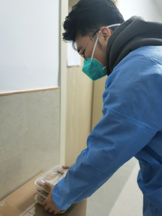 为了保证各位同学第一时间能够吃上热乎的饭菜,温宝山同学坚持每天6点起床,第一时间领取早餐,与其他各公司负责人及时沟通,协调运餐车使用,提高运送效率。在晚间协助分发试剂盒,收集试剂盒检测情况,最晚时直到11点依旧在统计结果。晨披朝露,只为准时准点将伙食送到同学身边。每一份准时送达的饭菜每一次不会缺失的分餐,背后是他们不曾言说的坚持,是始终铭记在心的责任。