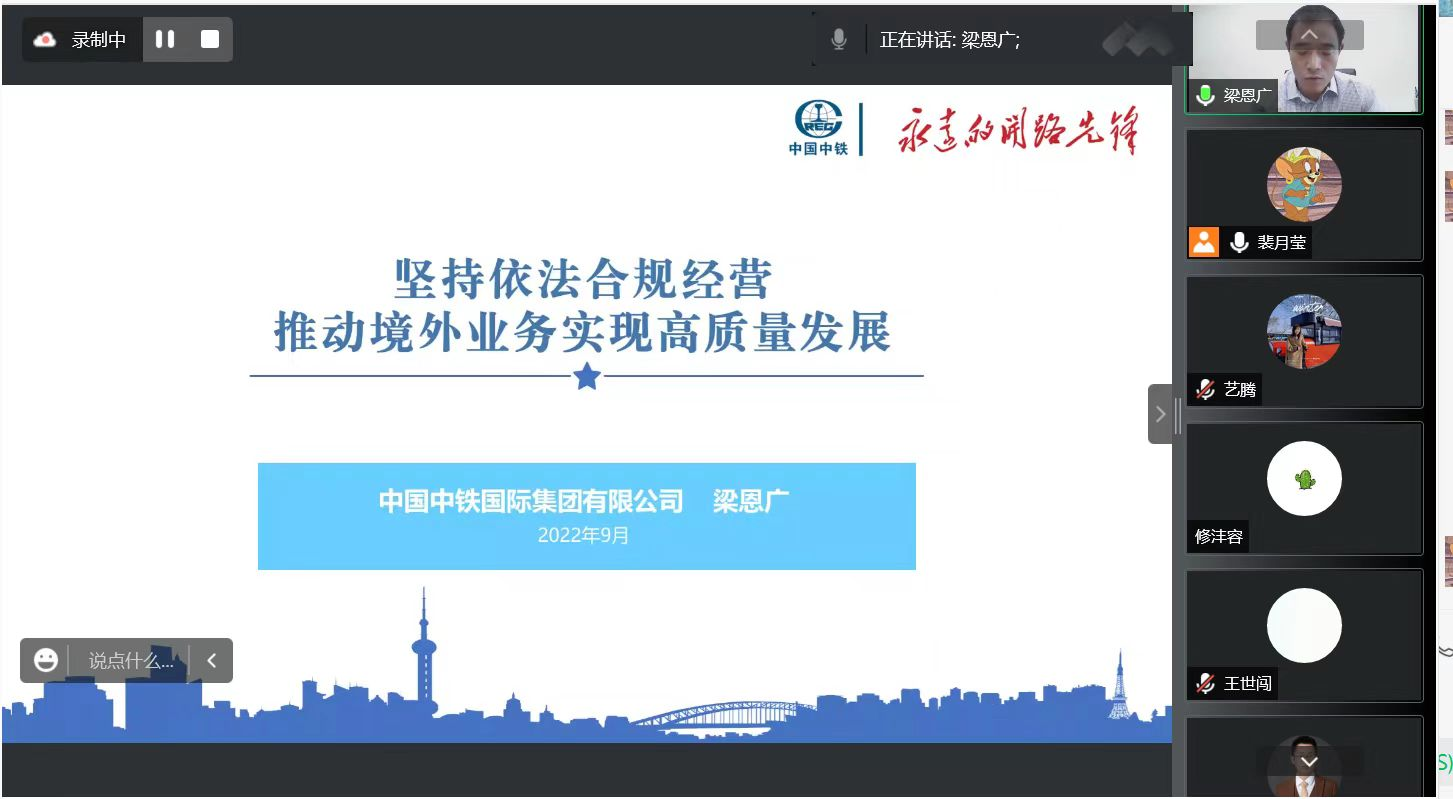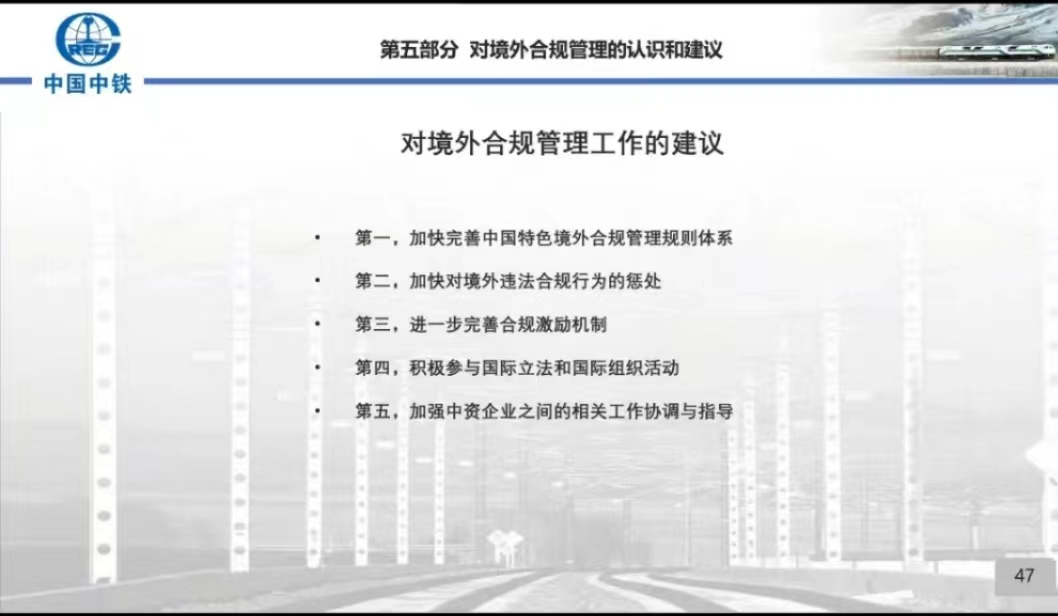 讲座最后一部分,梁恩广先生提出了对境外合规管理的认识和建议。“合规风险已经成为全球化公司的头等大事,我们没有避风港,境外合规风险一旦发生,将是我们不可承受之重”。关于境外合规管理,中国中铁秉承“五个坚持”:一 必须坚持党的领导;二必须坚持中国特色与遵循一般规律相统一;三必须坚持系统观念,统筹推进;四必须坚持内外有别;五必须坚持境外合规管理体系权威性。梁恩广先生还对更为广泛的中国企业中国政府的合规工作提出了建议。
