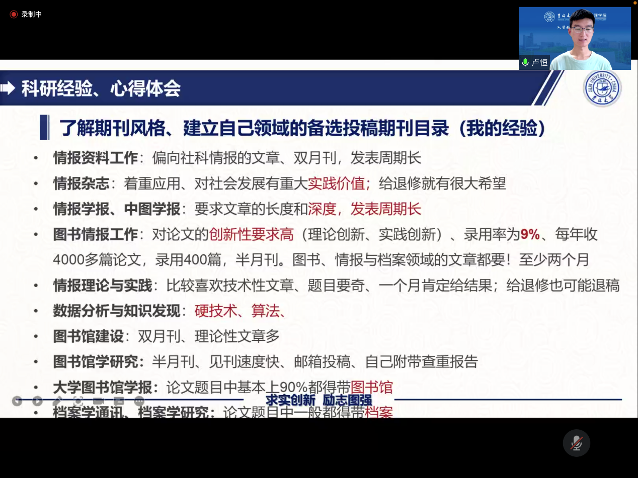 会议开始,裴月莹老师首先向大家简要介绍了卢恒学长,并对卢恒学长的到来表示热烈欢迎。随后卢恒学长开始分享,以自身硕博连读的经历为例子,讲述了自己如何在学术业绩成果和员工干部中相平衡。其次卢恒学长从三个视角分享自己的科研经验,分别是为什么写论文论文是写出来的么以及如何撰写论文初稿与选择投稿期刊,其中重点讲述了如何撰写论文初稿以及如何将论文投稿。