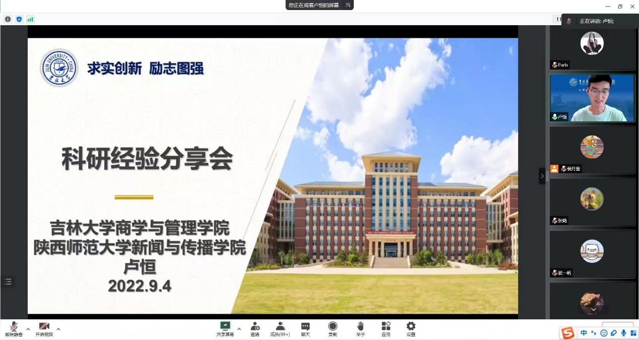 为了让同学们了解如何进行学术研究,营造一个学术氛围浓厚的环境,9月4日,公司邀请了2022级优秀博士毕业生卢恒,于线上开展EMC易倍官网十佳博士研究生学习经验分享会,向同学们分享自身的科研经验与心得体会。会议由裴月莹老师主持,EMC易倍全体新生参会。