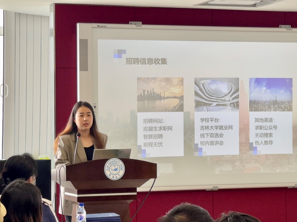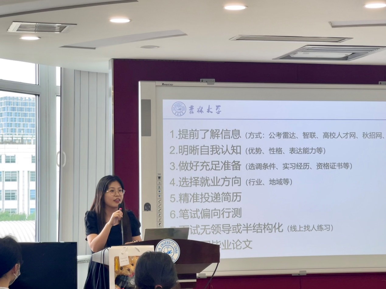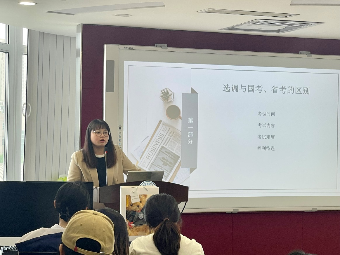 2021级硕士研究生罗慧,为同学们梳理了求职的过程,包含通过何种方式提前了解信息;从优势性格表达能力等方面明晰自我认知求职前提前做好目标岗位的准备,例如:选调条件实习经历资格证书等为求职打下牢固的基础;根据行业地域等条件选择自己的就业方向;精准投递简历,节省时间;笔试偏向行测;面试无领导或半结构化面试;建议同学们提前准备毕业论文等内容。