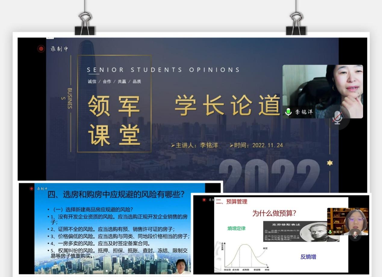 领军大讲堂是学长传经送宝与学弟学妹业务交流的课堂。我省优秀的会计领军毕业生徐宗丹李铭洋张玲玲三位学员,分别从他们参加领军培训班的学习经历培训班毕业后在工作中如何发挥引领辐射作用目前的工作实际和所处行业特点等视角,与学员们一道分享了生活中的房地产企业IPO上市盈利模式等精彩内容,让大家受益匪浅。